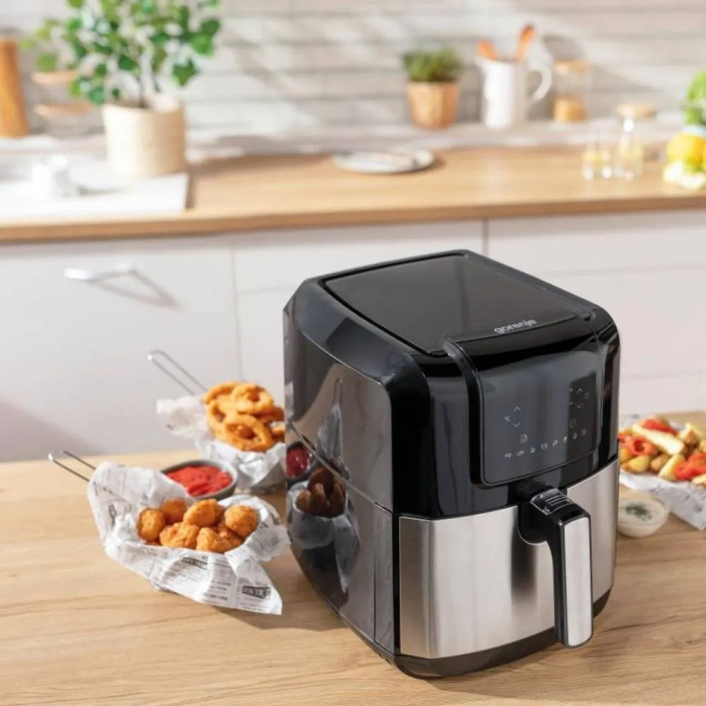 Friteza na vrući zrak Gorenje dolazi s posudom za pečenje kapaciteta 5 l i omogućava vam spremanje većih količina hrane. Vrući zrak kruži od vrha do dna i natrag preko unutrašnjih zidova posude do gornjeg dijela, što omogućava savršeno raspoređivanje topline. Rezultat je hrskava korica i nježno zapečena sredina. Posebna neprijanjajuća površina protiv lijepljenja na unutrašnjoj strani posude omogućava da se hrana ne zalijepi za zidove posude, tako da je možete poslužiti odmah nakon završetka pečenja. Skratite si vrijeme pripremanja hrane i uživajte u raznovrsnim okusima.