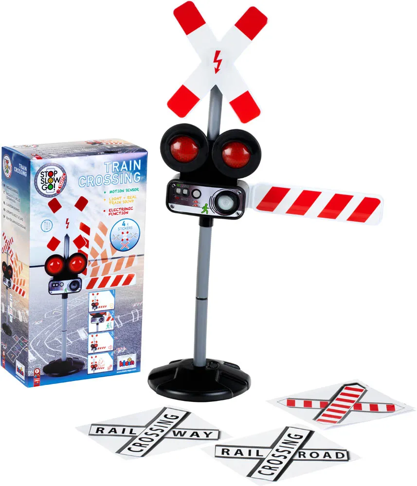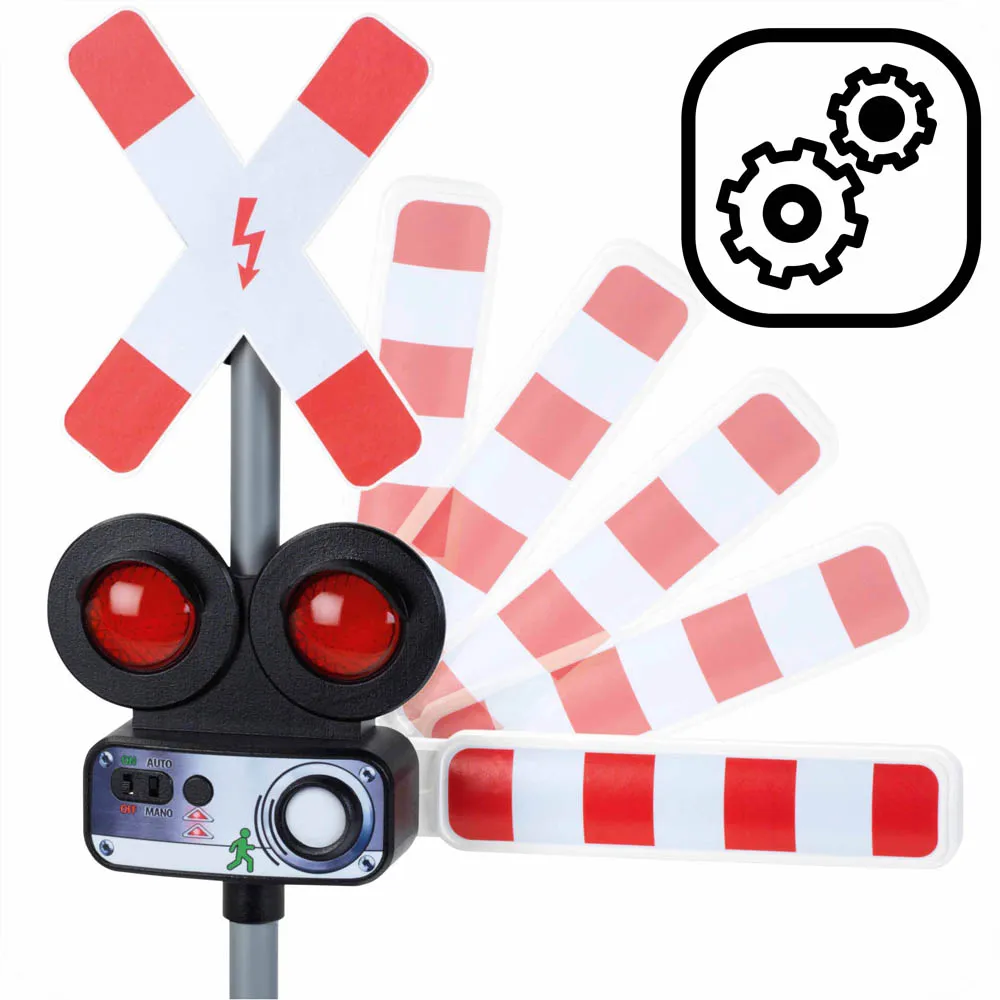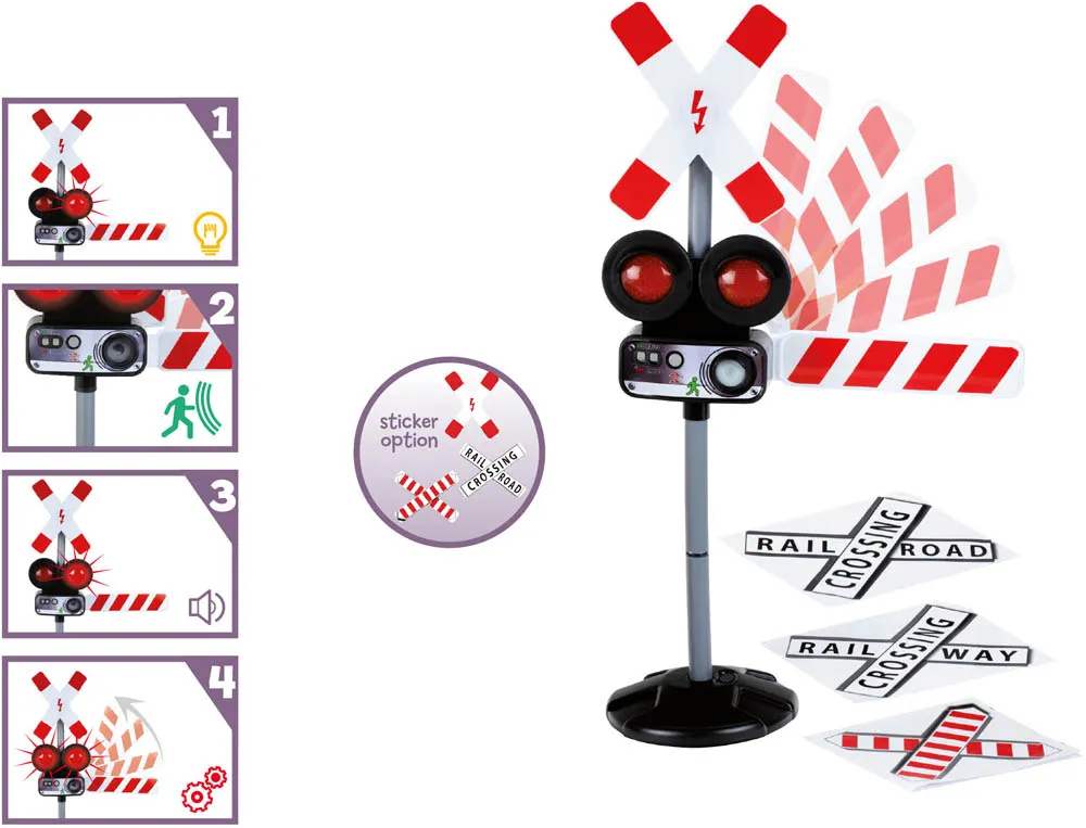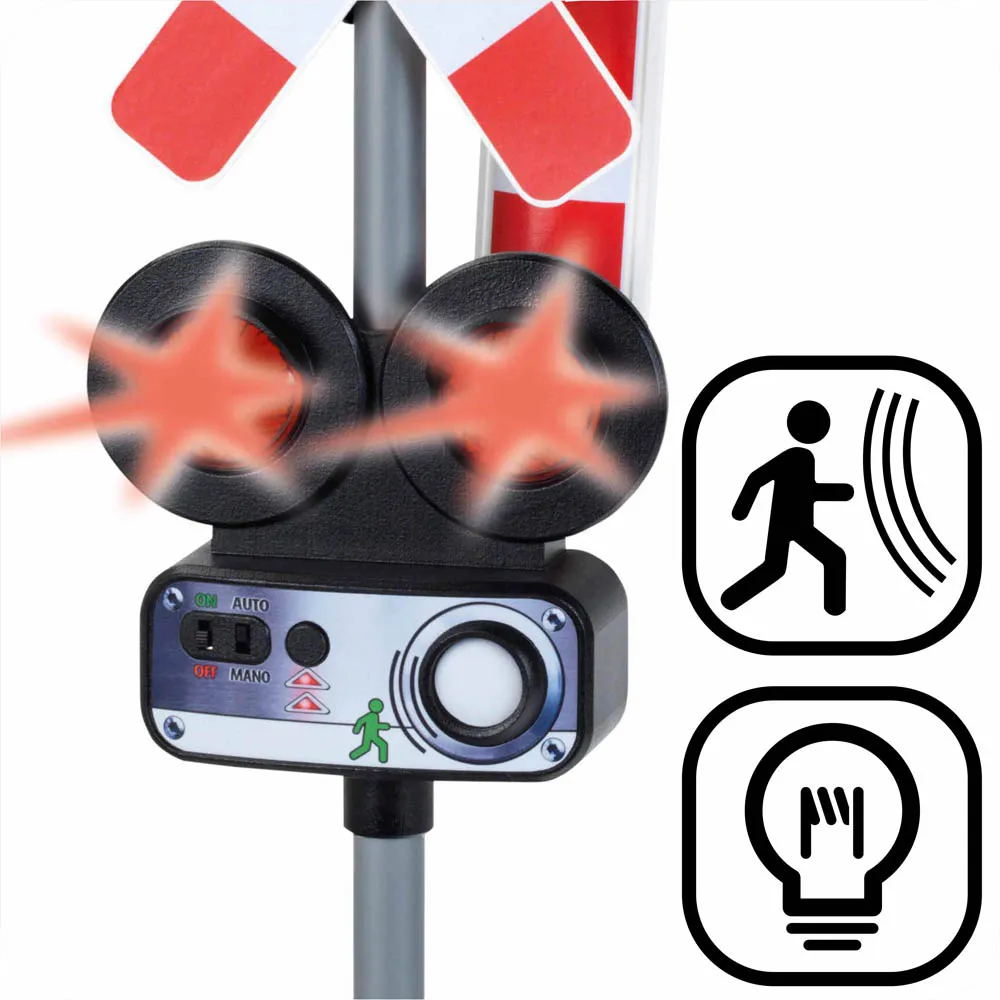 Pružni prijelaz s funkcijom svjetla i zvuka ima automatski i ručni rad po izboru. Ovaj mali pružni prijelaz može sve što i veliki - automatski uključuje crveno, podiže pomičnu rampu ili je zatvara uz odgovarajuće svjetlosne i zvučne efekte i tako uči i najmlađu djecu poštovati pravila. Željezničkim prijelazom se može upravljati i ručno kako bi mališani naučili savjesno čekati da se prijelaz ponovno oslobodi. U isto vrijeme, dječji prometno-obrazovni znak je sam po sebi stabilan - baza, koja podsjeća na prave mobilne prometne znakove, može se čak i otežati i učiniti još stabilnijom - samo je napunite vodom i semafor će izdržati vožnju malim biciklima, skuterima i triciklima.