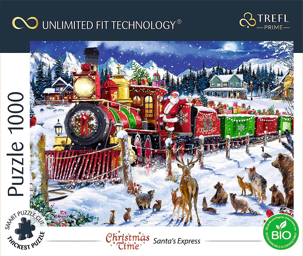Trefl Prime UFT puzzle slagalica od 1000 dijelova dizajnirana je za prave ljubitelje slagalica. Slagalica prikazuje božićni vlak te nakon sastavljanja stvara sliku dimenzija 68,3 x 48 cm. Slagalice su izrađene od visokokvalitetnih materijala, od najdebljeg kartona, jedinstvenih oblika i posebne metode rezanja. To vam omogućuje stvaranje personaliziranog kolaža i jednostavan transport cijele slagalice. Pojedinačne komponente UFT proizvoda izrađene su od ekološki prihvatljivih materijala. Vrećica za prikupljanje i naljepnice na kutiji izrađene su od biorazgradive folije. Proizvodi nisu omotani folijom. Preporučena dob: 8 ili više godina.
