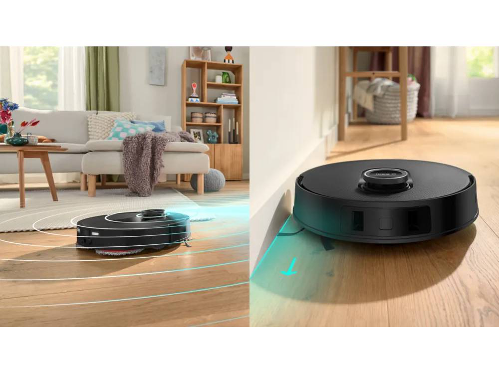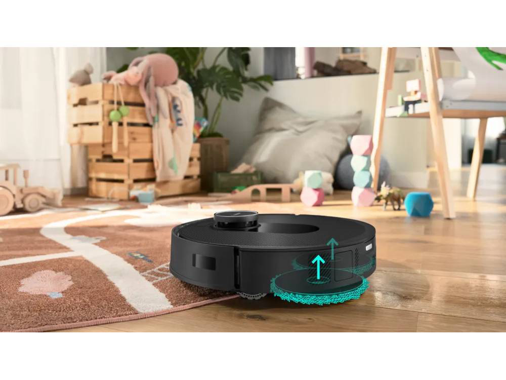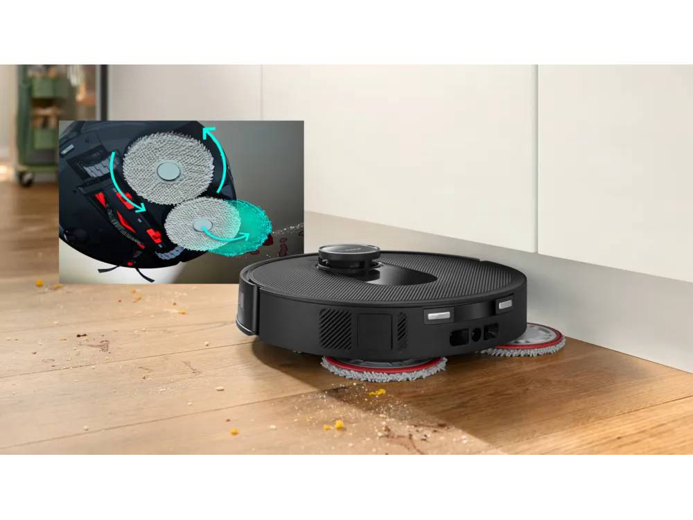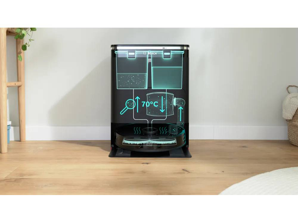 Zaboravite na prljavštinu s bilo koje vrste podova uz Carbon Power Brush koja ima tanke, gusto poredane čekinje za dubinsko čišćenje. Od malih čestica do oblaka prašine, bilo na tepisima ili tvrdim podovima, ova snažna četka rješava svakodnevni nered prije nego što se prašina stigne slegnuti. Mop s produženim dosegom doseže teško dostupna mjesta, pružajući temeljito mokro i suho čišćenje. Uklanja prljavštinu na udaljenosti manjoj od 2 mm od zidova i do 30 mm u kutovima, čime eliminira potrebu za ručnim čišćenjem i u najzahtjevnijim područjima. Suho-Mokra servisna stanica automatizira održavanje kako bi vaš Spotless savršeno funkcionirao. Automatski prazni spremnik za prašinu, a velika vrećica za prašinu od 3 L zahtijeva rjeđe pražnjenje, što sprječava kontakt s prašinom. Mopovi se peru na 70 °C—toplije nego većina ciklusa pranja—i suše se vrućim zrakom. Senzor prljavštine otkriva vrlo prljave mopove i pokreće dodatni ciklus čišćenja ako je potrebno. Funkcija smanjenog zapetljavanja omogućava nesmetano čišćenje sprječavanjem zapetljavanja dlaka u četki i smanjenjem blokada. Pomaže robotu da učinkovito usisava dlake, usmjeravajući ih u spremnik za prašinu, umjesto da ih rasprši po podu.