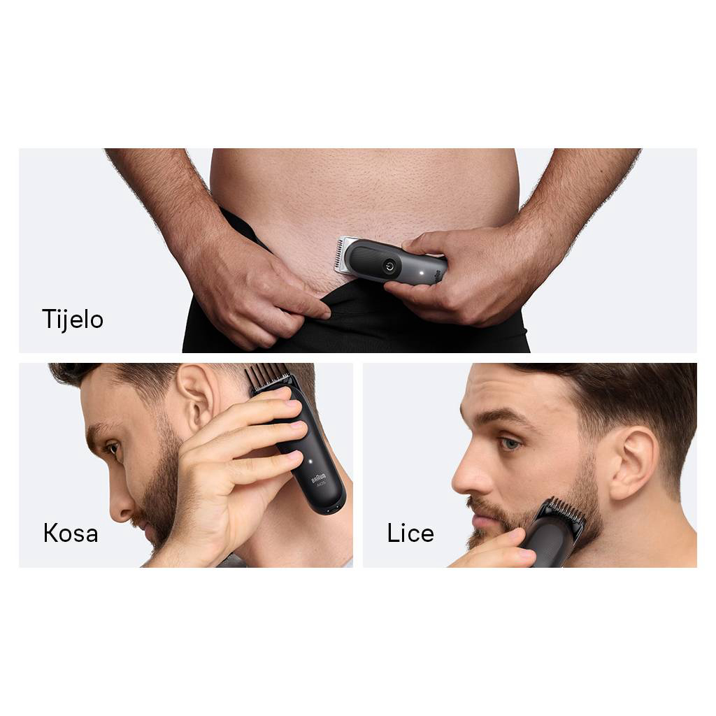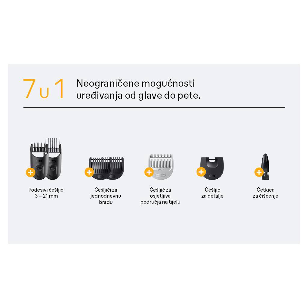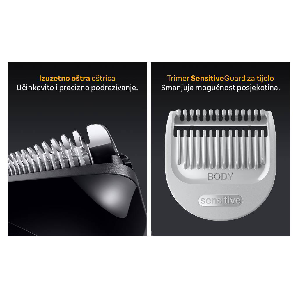 Braunov multifunkcionalni 7-u-1 komplet muškarcima omogućuje lako i jednostavno podrezivanje dlačica na licu, u nosu i u ušima, šišanje kose te uređivanje dlačica na cijelom tijelu. Iznimno oštra oštrica osigurava brzo i učinkovito, ali i ugodno i precizno podrezivanje. Tehnologija SensitiveTrim brine o tome da savršeno i sigurno podrežete dlačice na cijelom tijelu. Možete birati između 14 duljina, a drška AquaGrip pruža vam potpunu kontrolu pod vodom. AIO5520 dolazi u sivoj boji mjesečevog kamena, stvoren je da traje, vodootporan je i ima litij-ionsku bateriju koja omogućuje do 120 minuta rada.