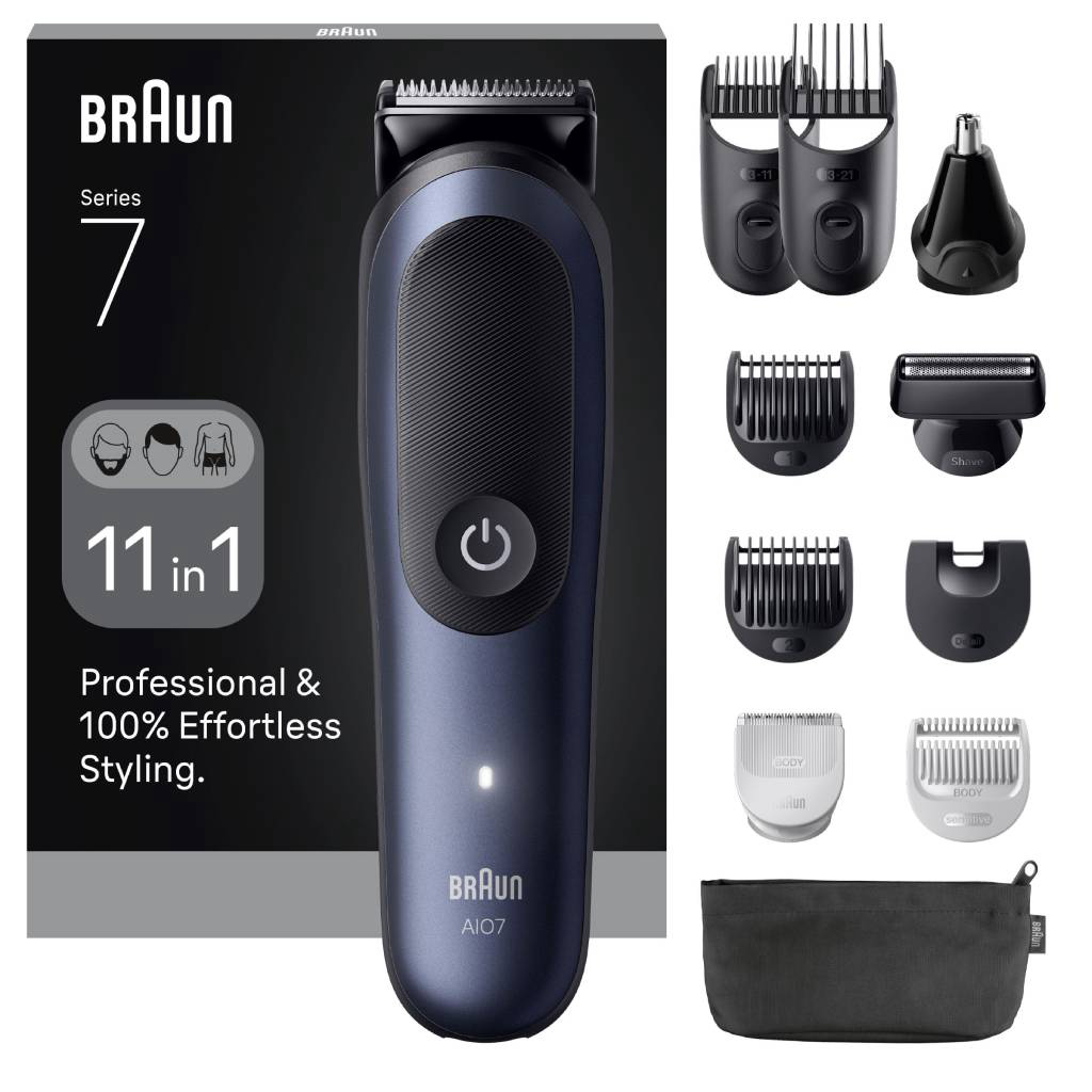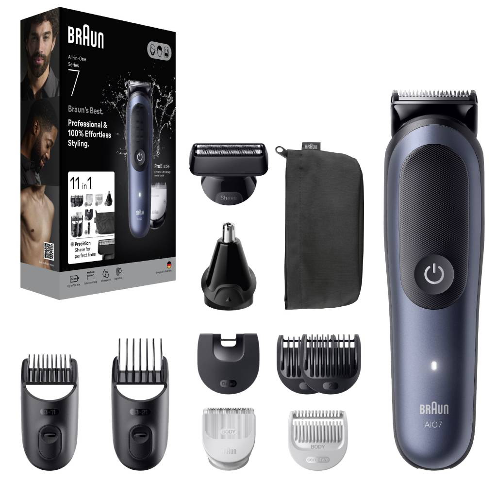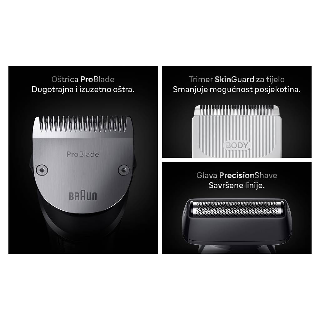 Braunov najbolji multifunkcionalni komplet za muškarce 11-u-1 omogućuje lako i jednostavno podrezivanje dlačica na licu, u nosu i u ušima, šišanje kose te uređivanje dlačica na cijelom tijelu. Izuzetno oštra oštrica ProBlade i tehnologija AutoSense omogućuju izuzetnu preciznost na svakom tipu brade. Glava PrecisionShave stvorena je da pruži precizno brijanje i savršene linije. Možete birati između 14 duljina, a drška AquaGrip pruža vam potpunu kontrolu pod vodom. AIO7540 dolazi u tamnoplavoj metalik boji, stvoren je da traje, vodootporan je i ima litij-ionsku bateriju koja omogućuje do 120 minuta rada.