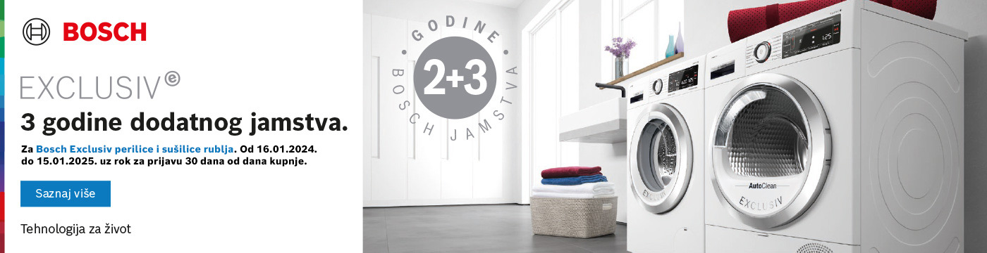 Uz 2 godine tvorničkog jamstva prijavom na MyBosch portalu možete produžiti jamstvo za dodatne 3 godine za Exclusiv perilice i sušilice rublja kupljene u periodu od 16.01.2024. do 15.01.2025. godine uz rok za prijavu 30 dana od dana kupnje.