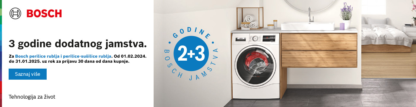 Uz 2 godine tvorničkog jamstva prijavom na MyBosch portalu možete produžiti jamstvo za dodatne 3 godine za Bosch perilice rublja i perilice-sušilice rublja kupljene u periodu od 01.02.2024. do 31.01.2025. godine uz rok za prijavu 30 dana od dana kupnje.