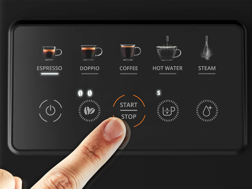Savršena kava i espresso puni arome zahvaljujući čvrstom mlincu od nehrđajućeg čelika, automatskom tampiranju i tlaku od 15 bara. Dizajn koji štedi prostor, širok svega 15 cm — oko 50 % kompaktniji od klasičnog uređaja za kavu od zrna do šalice — za maksimalnu praktičnost. Dovoljan je samo jedan dodir na intuitivnoj upravljačkoj ploči za svježe mljevenu kavu: Espresso i Lungo. Jednostavno prilagodite jačinu. Već mljevenu kavu ubacite izravno u pretinac za kavu. Savršeno za ljubitelje kave bez kofeina. Nakon svakog ciklusa pripreme jednostavno ispraznite spremnik za talog kave. Vaš je uređaj spreman za sljedeću šalicu. Odaberite jednu od 3 razine mljevenja za savršene rezultate bez obzira na recept.