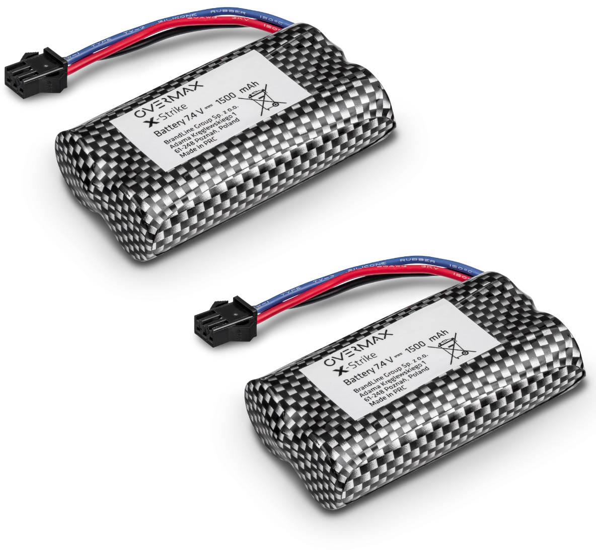 Overmax X-Strike ima dvije litijeve baterije od 1500 mAh, 7,4 V koje se montiraju na automobil pomoću čičak trake za jednostavnu montažu i uklanjanje.