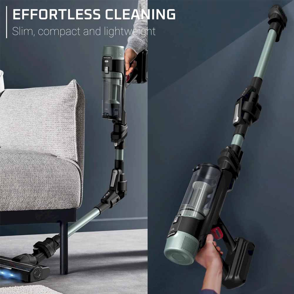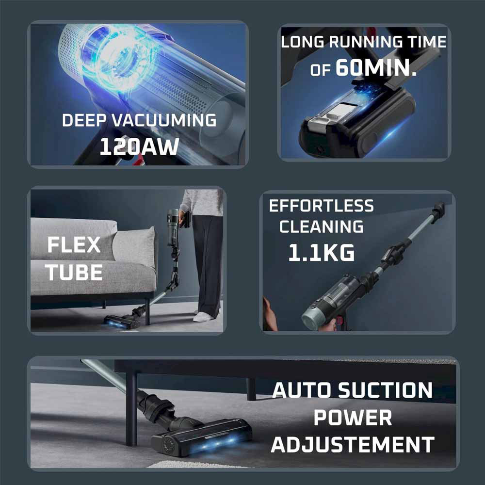 Zahvaljujući snažnoj usisnoj snazi koja vaš dom u trenu ostavlja besprijekorno čistim, X-FORCE FLEX 10.80 ključ je čišćenja doma bez napora. Ovaj bežični štapni usisavač ima veliku usisnu snagu do 120 AW, četku za sve vrste podova s plavim LED svjetlima i automatskom prilagodbom usisne snage ovisno o podlozi, dugotrajnu bateriju s vremenom rada do 60 minuta i još mnogo toga. Sve to u laganom dizajnu, težine samo 1,1 kg u ručnom načinu rada, za iznimnu jednostavnost čišćenja.