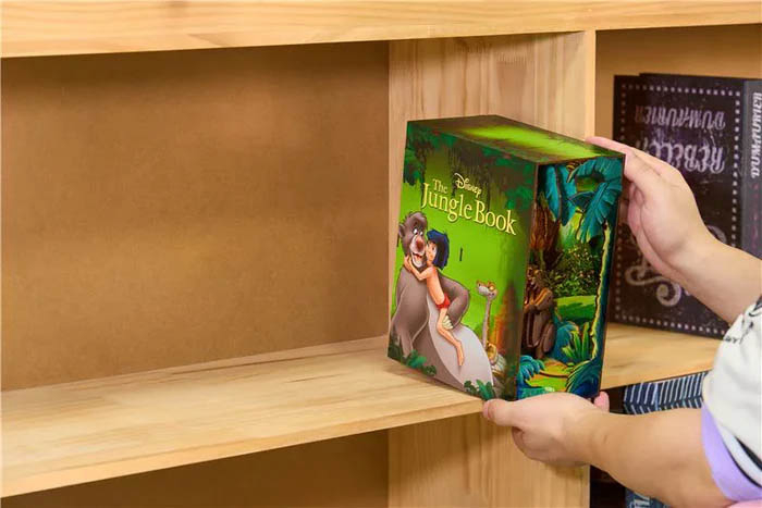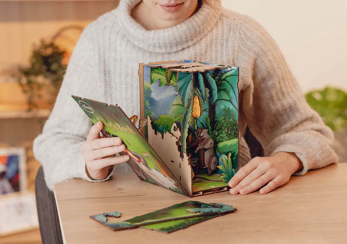 Revell Tiny Adventures The Jungle Book (Knjiga o džungli) – detaljan book nook 3D model za policu s knjigama inspiriran Disney animiranim filmom. Model se sastavlja u minijaturnu džunglu koja se postavlja između knjiga i stvara efekt skrivenog svijeta s prizorima iz priče o Mowgliju. Čarobnu džunglu iz priče o Mowgliju; scene inspirirane likovima poput Balooa i Bagheere, 3D mini svijet koji se vidi između knjiga na polici, atmosferu Disney klasika u dekorativnoj formi. Disney The Jungle Book Revell Tiny Adventures book nook – dekorativni, LED osvijetljeni kolekcionarski 3D model za slaganje, namijenjen fanovima Disneyja i ljubiteljima kreativnih diorama.