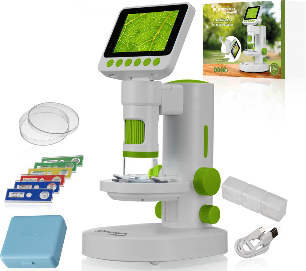 Veliki 3,5-inčni LCD zaslon olakšava pregledavanje uzoraka u izvanrednim detaljima. Možete podesiti kut zaslona kako biste osigurali maksimalnu udobnost tijekom promatranja. Za još bolje rezultate, osvijetljena pozornica omogućuje vam poboljšanje prikaza podesivim bojama i postavkama svjetline. A uz sav pribor koji će vam trebati - od pincete i Petrijeve zdjelice do unaprijed pripremljenih preparata - možete odmah početi istraživati.