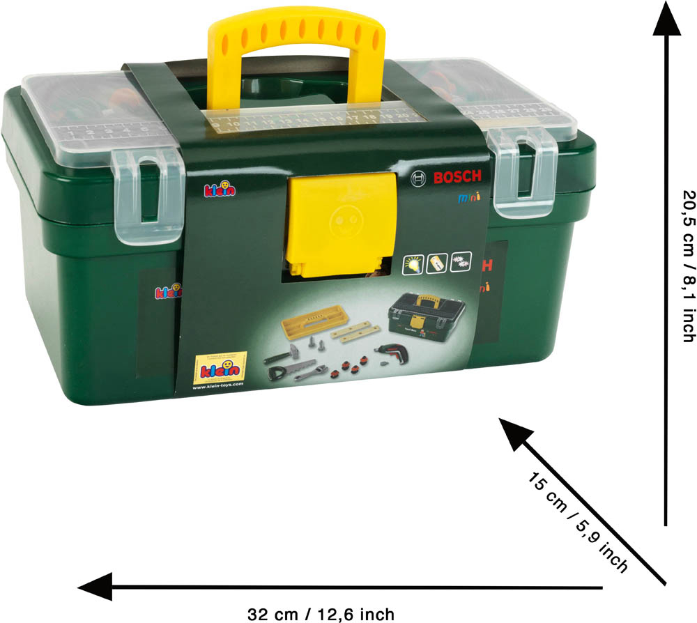 Ova Bosch kutija s alatom sadrži sve što Vaš zauzeti mališan može poželjeti - čekić za zabijanje čavala u letvice, praktičnu pilu i ključ za vijke i matice. A usred svega toga nalazi se bežični odvijač koji će ubrzati dječja srca - Ixolino II na baterije. Vjerno je izrađen, s izmjenjivim nastavcima, vrtnjom naprijed i natrag, te pri radu proizvodi užurbano zujanje. Svi alati su replike Bosch dizajna prilagođene djeci, izrađene od robusne, visokokvalitetne plastike, sa zaobljenim rubovima i optimalno prilagođene malim rukama. Mogu se lako pohraniti u kutiju s praktičnom ručkom za nošenje i ponijeti bilo gdje gdje su potrebne spretne i zauzete ruke. Dimenzije: 32 cm x 20,5 cm x 15 cm. Potrebne baterije: 2xAAA (nisu uključene). Preporučena dob: 3 ili više godina.