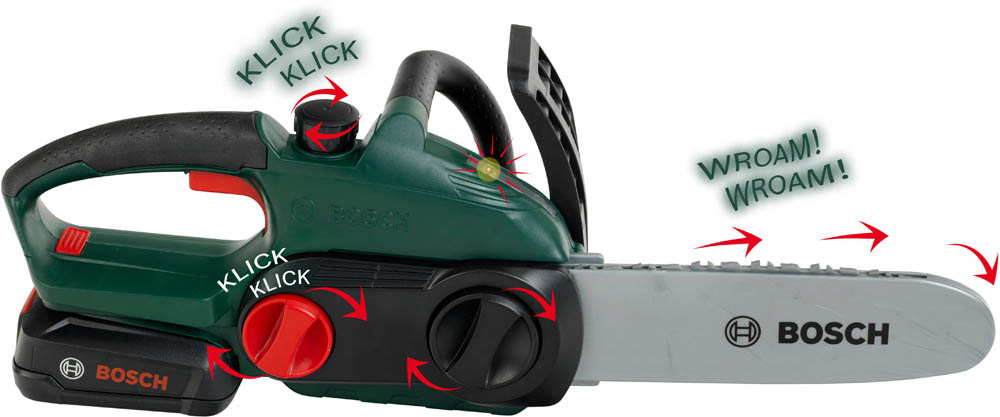 S Klein Bosch Lumberjack setom mali šumski radnici su savršeno opremljeni! Bosch motorna pila na baterije impresionira realističnim funkcijama - kada se pričvrsti list pile, čuje se autentičan zvuk piljenja, dok bljeskajuće svjetlo simulira rad. Za još više zabave, list pile se može zamijeniti. Robusna šumarska kaciga podesiva je po veličini s pomičnim vizirom i štitnicima za uši, a odgovarajuće rukavice pružaju pravi osjećaj drvosječe. Ovaj set potiče motoričke vještine, stimulira maštu i upoznaje djecu s korištenjem alata na razigran način. Dimenzije: 52,4 cm x 20 cm x 34,9 cm. Potrebne baterije 3xAA (nisu uključene). Preporučena dob: 3 ili više godina.