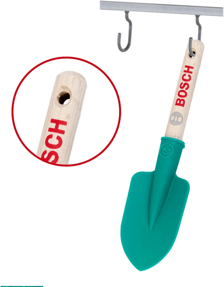 Vrtni set za djecu uključuje čvrste igračke alata popularnog Bosch dizajna: lopaticu, grablje, lopatu i motiku. Prethodno izbušena ušica za vješanje vrtnog alata posebno je praktična.