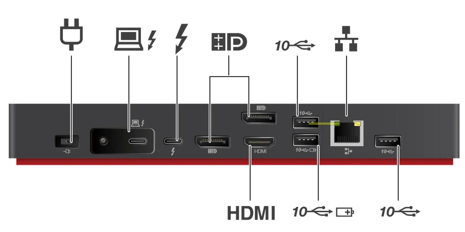 | 1x Audio In/Out, 1x RJ45, 2x Display Port, 1x HDMI, 4x USB-A, 1x USB-C, 2x Thunderbolt 4 | |