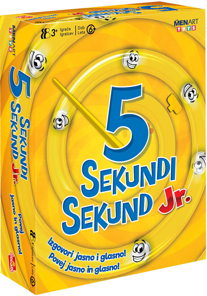 5 sekundi Junior je brza i zabavna društvena igra prilagođena djeci i obiteljima, nastala kao dječja verzija popularne igre 5 Second Rule. Cilj igre je u samo pet sekundi navesti tri odgovora koja odgovaraju zadanoj kategoriji, poput životinja, hrane ili predmeta iz svakodnevnog života. Jedan igrač pročita pitanje s kartice, pokrene se mjerač vremena, a igrač na potezu mora brzo odgovoriti kako bi pomaknuo svoju figuru naprijed na igralnoj ploči. Igra se nastavlja dok jedan od igrača ne stigne do cilja. Zahvaljujući jednostavnim pravilima i kratkom vremenu za razmišljanje, igra potiče spontanost, smijeh i brzinu razmišljanja te razvija dječji rječnik i koncentraciju. Namijenjena je za tri ili više igrača, preporučena za djecu od šest godina naviše i idealna za obiteljska druženja, dječje zabave i rođendane. Igra je namijenjena za 3 ili više igrača. Preporučena dob: 6 ili više godina.