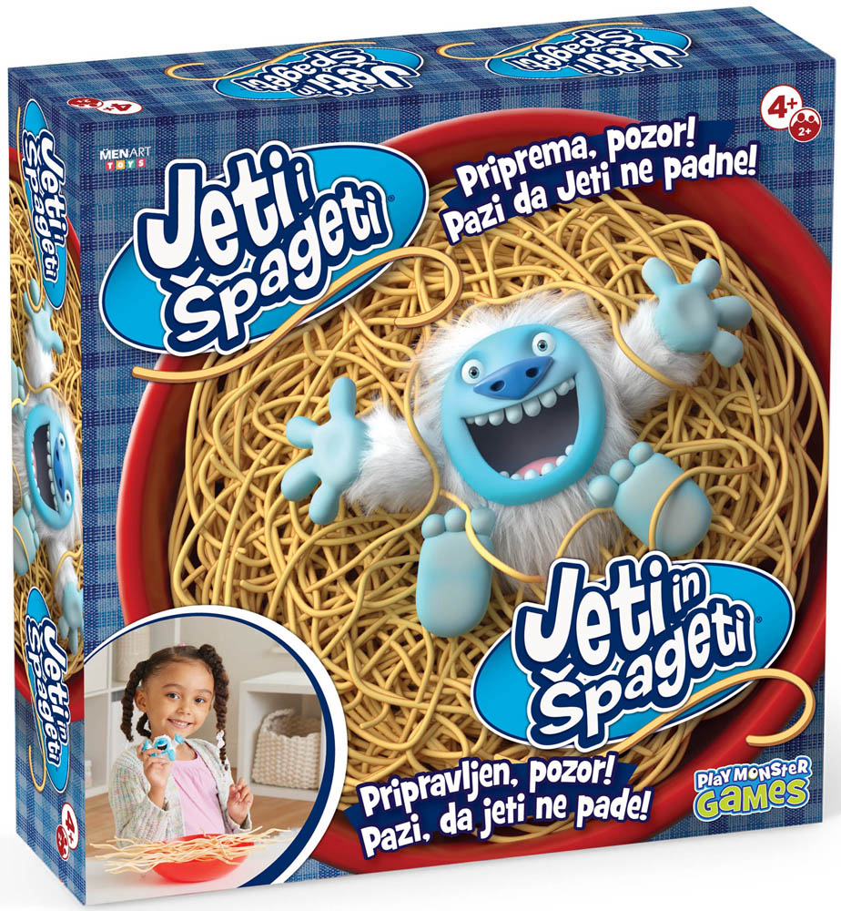 U Jeti i špageti pažljivo uklanjajte plastične niti špageta jednu po jednu, pazeći da ne srušite simpatičnog Jetija. Igra zahtijeva mirnu ruku i malo sreće, jer igrač koji sruši Jetija u zdjelu gubi! Igra je namijenjena za 2 ili više igrača. Preporučena dob: 4 ili više godina.