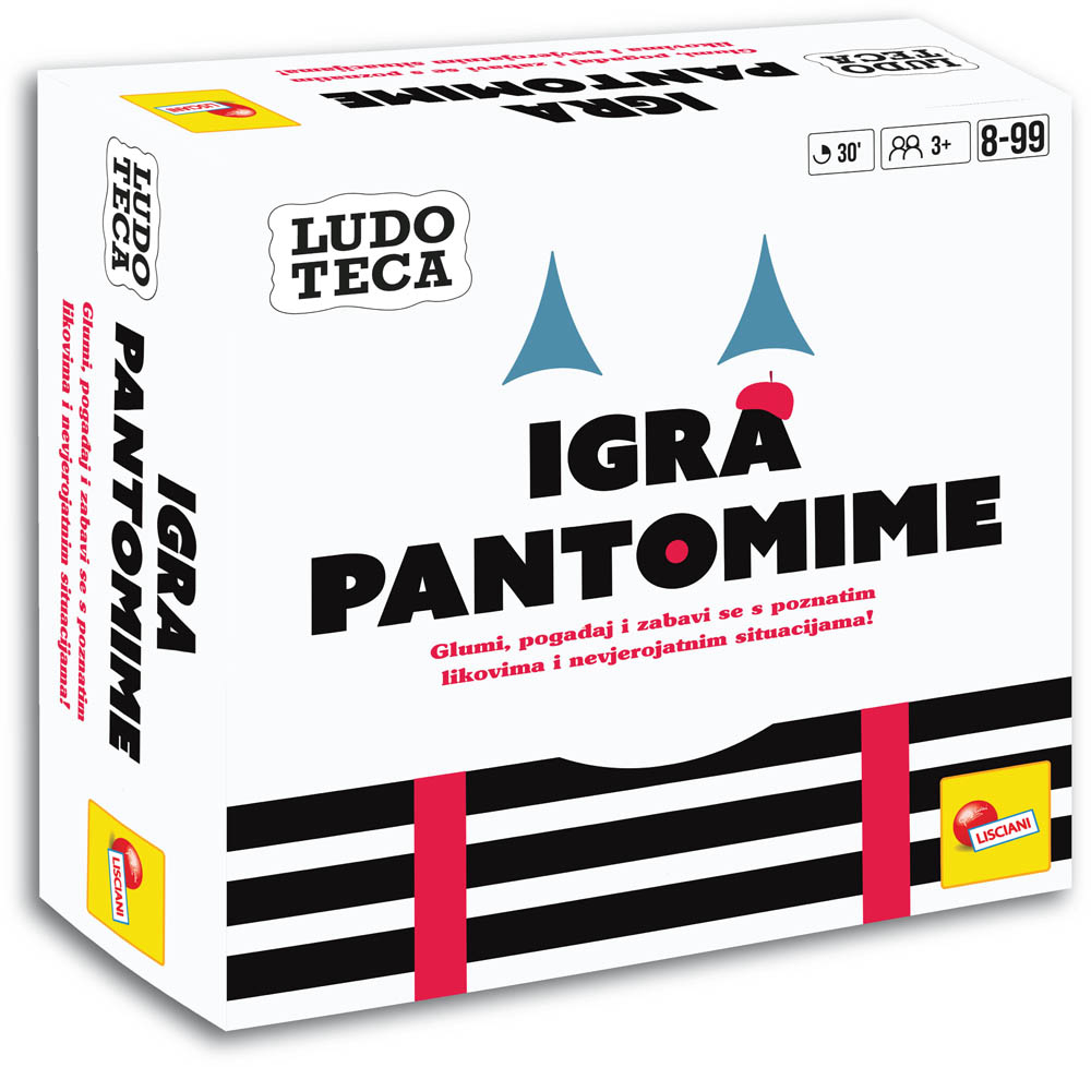 Pantomima je društvena igra za 3 ili više igrača puna smijeha i nepredvidivih situacija u kojoj igrači kroz duhovitu i otkačenu pantomimu glume zadane pojmove i izazove, što je čini odličnim izborom za obiteljska druženja, zabave i opuštene večeri s prijateljima. Sadržaj pakiranja: 1x velika ploča za igranje, 56x kartica, 4x figurica, 1x spinner, 12x žetona, 1x uputstva. Baterije nisu potrebne. Preporučena dob: 8 ili više godina.