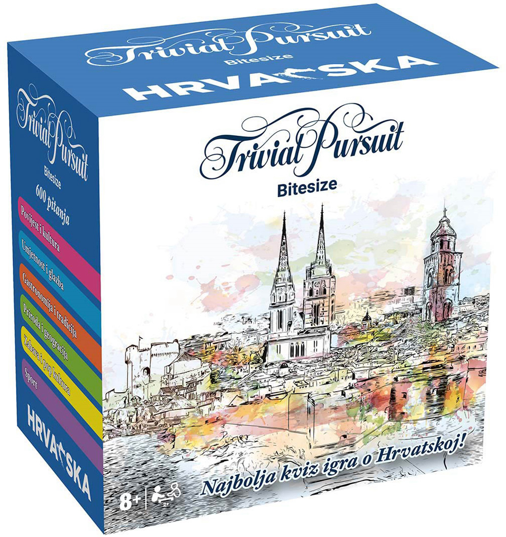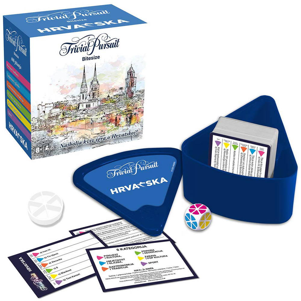 Trivial Pursuit Hrvatska je kviz-društvena igra prilagođena hrvatskom jeziku i kulturi u kojoj 2 do 6 igrača odgovara na pitanja iz različitih područja poput povijesti, geografije, zabave, sporta, znanosti i umjetnosti kako bi prikupili svih šest dijelova svoje figurice i stigli do završnog pitanja. Igra potiče znanje, razmišljanje i natjecateljski duh, traje otprilike 45 do 90 minuta te je idealna za obiteljska i prijateljska druženja jer kombinira zabavu s učenjem uz velik broj pitanja koja uključuju i teme vezane uz Hrvatsku. Preporučena dob: 8 ili više godina.