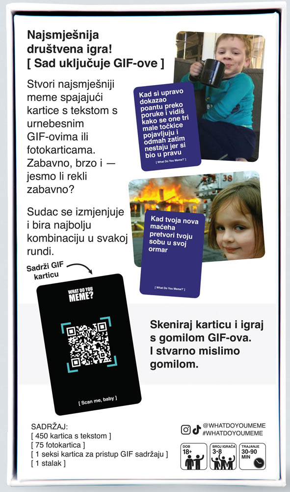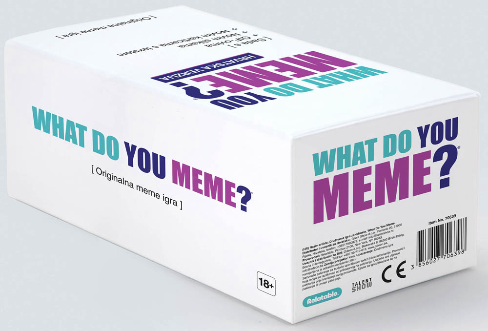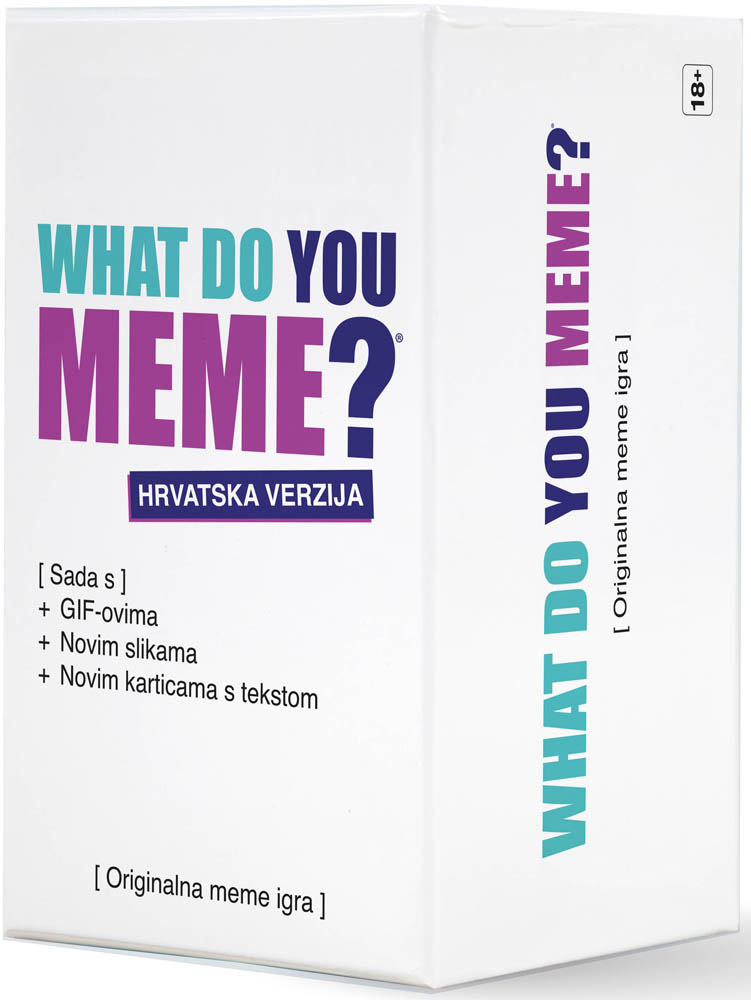 What Do You Meme? (hrvatska verzija) je urnebesna društvena igra za sve koji vole memeove i dobru zabavu! Stvaraj najsmješnije meme kombinirajući kartice s tekstom i fotokartice, a sada i GIF-ove uz pomoć posebne kartice s QR kodom. U svakoj rundi jedan igrač je sudac koji bira najzabavniju kombinaciju, a igrači se natječu tko će skupiti najviše pobjedničkih rundi. Idealan izbor za druženja i večeri pune smijeha! Sadržaj pakiranja: 450 kartica s tekstom, 75 fotokartica, 1 seksi kartica za pristup GIF sadržaju, 1 stalak. Trajanje igre: 30–90 minuta. Broj igrača: 3–20. Preporučena dob: 18 ili više godina.