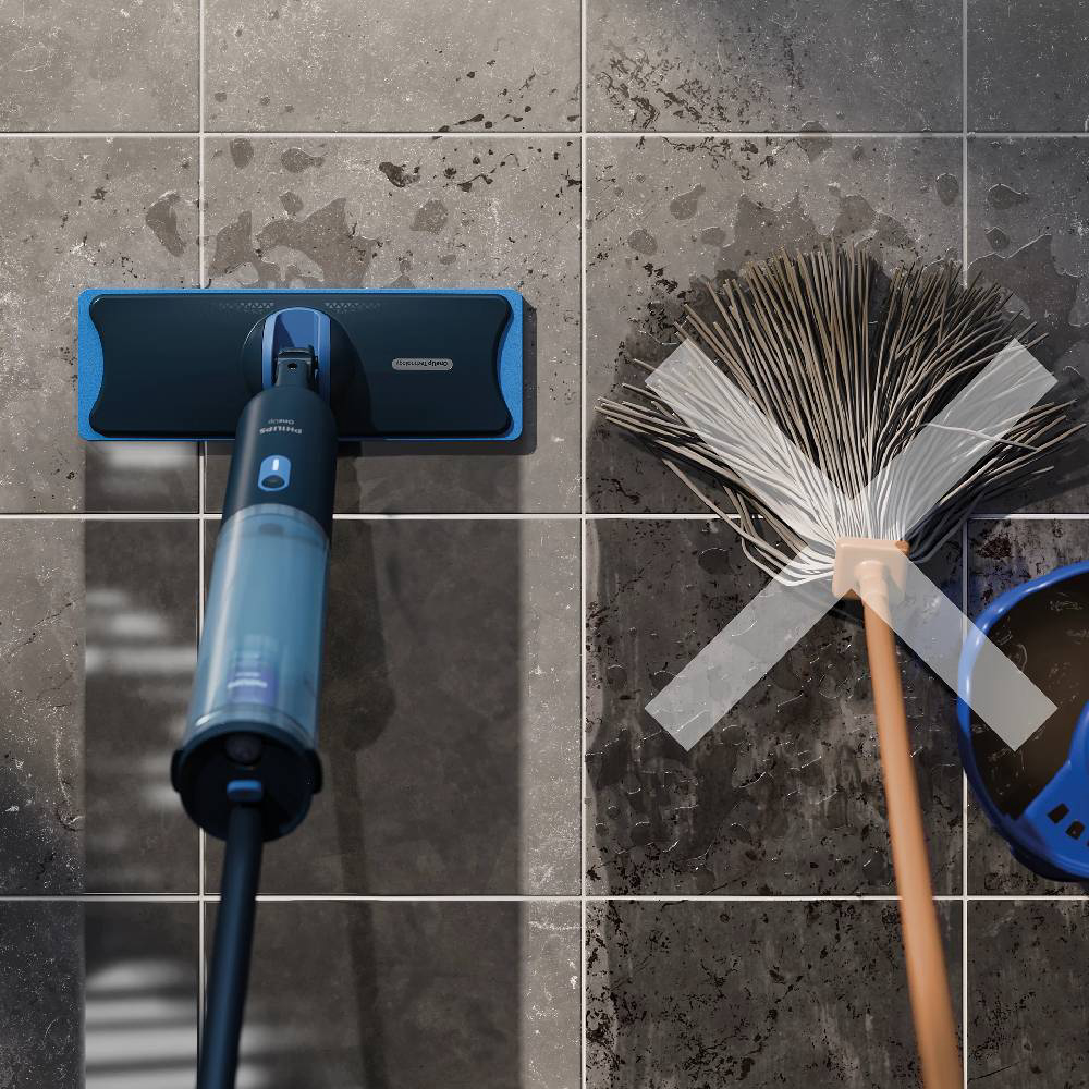 Philips OneUp električni mop pruža 2x čišće podove 2x brže. Odvodi prljavu vodu dok istovremeno ispušta čistu vodu na pod za besprijekorni sjaj. Uživajte u čišćenju podova bez komplikacija, bez potrebe za kantama, cijeđenjem ili ispiranjem. Čista i prljava voda uvijek su odvojene zahvaljujući integriranim spremnicima za vodu. Idealan za stan do 125 m2, zahvaljujući pokrivenosti od 50 m2 s jednim spremnikom vode. Čisti tvrde podove uključujući osjetljive i neupijajuće podove poput laminata, pločica bez teksture, vinila, drvenih podova poput parketa, lijevanih podova i kamena.