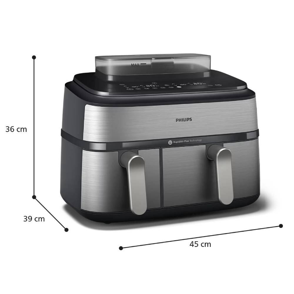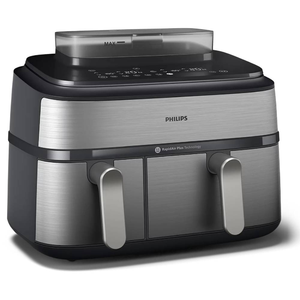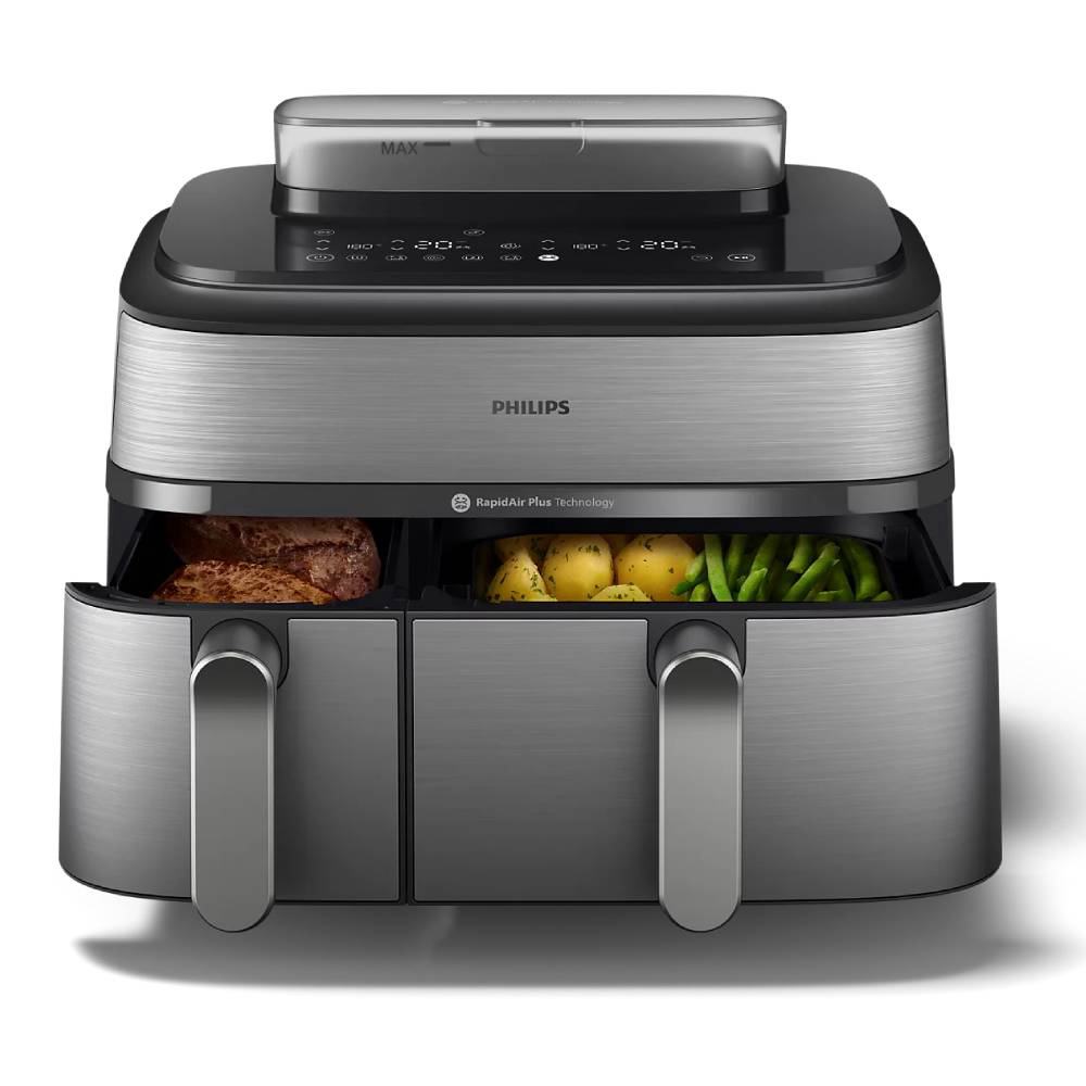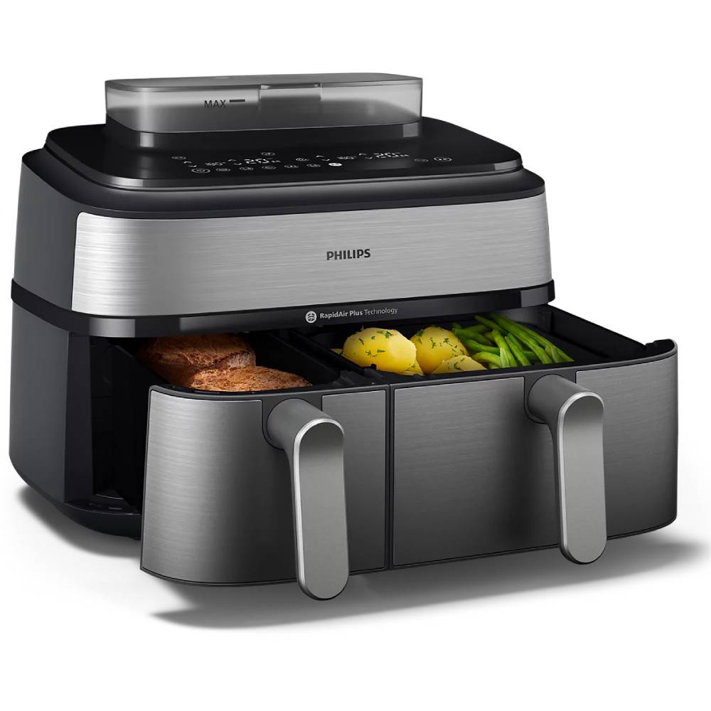Uz Philips NA555/00 Airfryer možete kuhati različite sastojke na različite načine bez muke oko koordiniranja više lonaca i tava. Možete odabrati metodu kuhanja koja najbolje odgovara vašim sastojcima: prženje, kuhanje na pari ili kombinaciju oboje. Tehnologija RapidAir Plus s jedinstvenim dizajnom u obliku zvijezde osigurava brži protok vrućeg zraka i usmjerava ga oko hrane i kroz nju, a pritom osigurava ravnomjerno kuhanje iznutra i izvana za pripremu ukusnih domaćih obroka. Automatski sinkronizirajte vrijeme kuhanja u 2 košare kako bi obroci bili spremni u isto vrijeme. Tehnologija Air Steam osigurava dobar pritok pare za postizanje meke i nježne teksture povrća, ribe, okruglica ili peciva, a da nisu gnjecavi ili vodenasti.