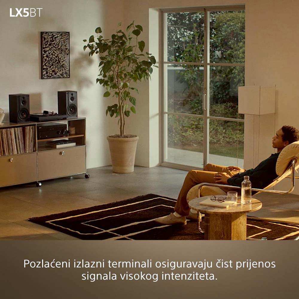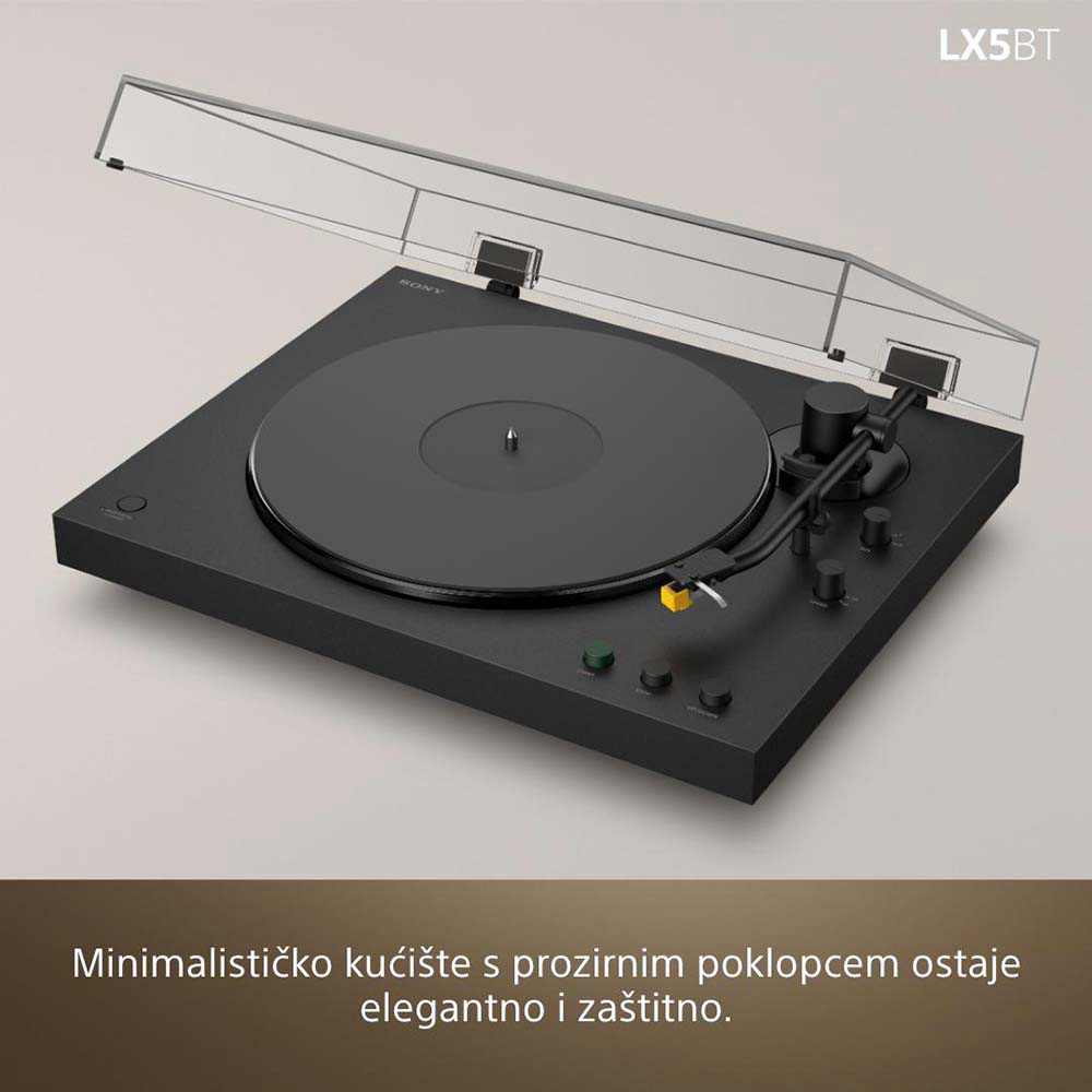 Namijenjen ljubiteljima glazbe koji cijene vrhunsku kvalitetu zvuka i elegantan dizajn, ovaj Bluetooth gramofon nudi premium iskustvo slušanja vinila od početka do kraja. Zahvaljujući potpuno automatskom remenskom pogonu, dovoljno je pritisnuti tipku Play i prepustiti se uživanju. Visokokvalitetna MM zvučnica ima pritisak igle od 2,0 g ± 0,5 g, što osigurava detaljnu i preciznu reprodukciju zvuka, dok audio krugovi audiofilskog ranga omogućuju slušanje bez izobličenja. Pomoću podesivog prekidača za pojačanje (gain) imate potpunu kontrolu nad izlaznom razinom. Precizno izrađeno, jednodijelno kućište smanjuje neželjene vibracije. Opremljeno je aluminijskom ručkom (tonearmom) za glatko praćenje ploče, lijevanim aluminijskim tanjurom koji pruža čvrstoću i stabilnost te gumiranom podlogom visokog prianjanja koja drži ploču sigurno na mjestu. Sa svojim minimalističkim dizajnom, PS-LX5BT odlično se uklapa u svaki prostor, a prozirni poklopac visoke prozirnosti štiti gramofon bez narušavanja njegovog izgleda.