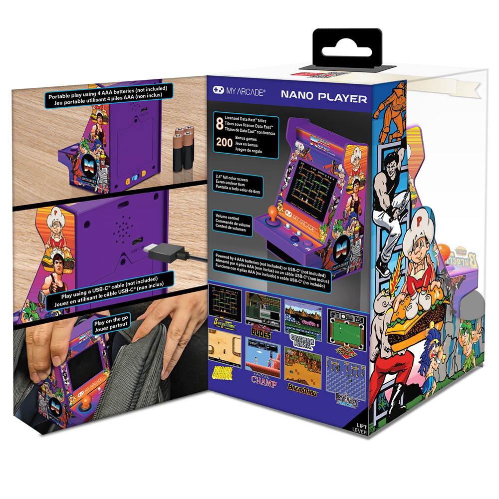 Igraća konzola My Arcade Nano Player 4.5'' Data East Portable Retro Arcade. 8 službeno licenciranih Data East naslova + dodatnih 200 retro igrica. Data East Hitovi uključuju BurgerTime™, Bad Dudes™, Karate Champ™, Caveman Ninja™, Side Pocket™, Heavy Barrel™, BreakThru™ i B-Wings™. Zaslon u boji visoke rezolucije od 2,4". Napaja se s 4 AAA baterije (nisu uključene) ili USB-C kabelom (nije uključen). Ugrađeni zvučnik s kontrolom glasnoće. Igrajte kod kuće ili u pokretu.