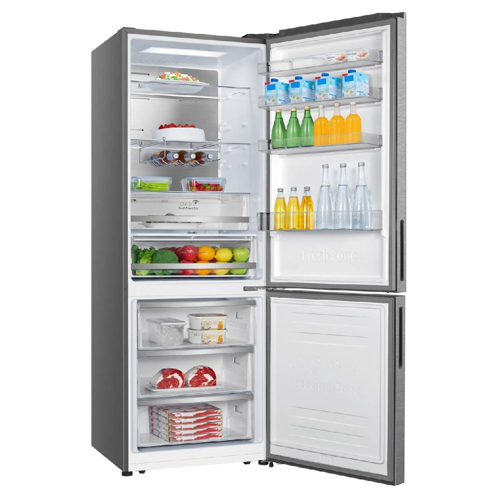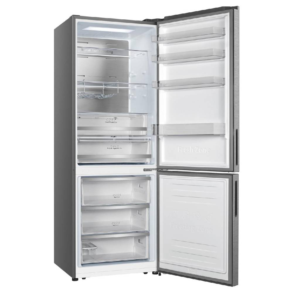 Ovaj hladnjak-zamrzivač savršeno će se uklopiti u vašu kuhinju s novim dizajnom dubine pulta, a istovremeno nudi obilje fleksibilnog prostora za pohranu. S tehnologijom Total No Frost u hladnjaku se ne stvara led, što odmrzavanje čini stvar prošlosti. Također će vašu hranu dulje zadržati svježom i hranjivom. Lako pregledna elektronska upravljačka ploča čini namještanje temperature još preciznijim, a prebacivanje između režima rada hladnjaka je lakše nego ikada. Moderni inverter kompresori mjere uvjete unutar vašeg hladnjaka i u skladu s tim održavaju hlađenje kako bi osigurali stabilnu temperaturu, uštedjeli energiju i bili tiši, a istovremeno produžili vijek trajanja hladnjaka. Moderni dizajn s reverzibilnim vratima uklopit će se savršeno u svaku kuhinju. Također, vrata se mogu otvarati s lijeve ili desne strane, ovisno o tome jeste li ljevoruki ili desnoruki ili kako je hladnjak smješten u vašoj kuhinji.