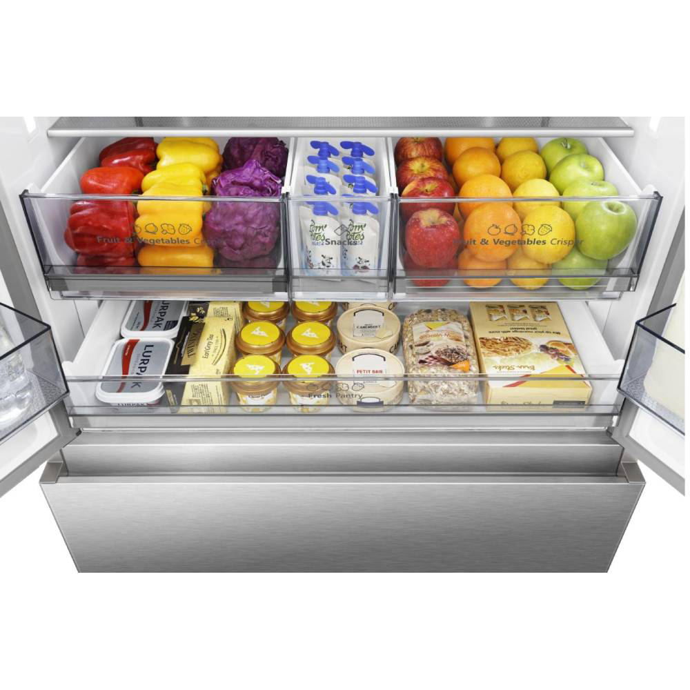Vaš hladnjak je službeno središte zabave. Aparat za led osigurava da dobro raspoloženje ne jenjava stalnim dobavljanjem novih kockica leda. S izdašnim kapacitetom od više od 1,3 kg kockica leda dnevno, uvijek ćete biti spremni za bilo koje piće, od koktela do čiste vode. To je vaša osobna ledena oaza, spremna u trenu. Stražnja stijenka hladnjaka prekrivena je nehrđajućim čelikom, što osigurava ravnomjernu raspodjelu hladnog zraka iznutra prema van. Ova kombinacija naprednih tehnologija osigurava idealnu razinu temperature i vlažnosti u svakom trenutku. Zamrznuta hrana sad je još dostupnija, čak i ona najvećeg obujma. Zahvaljujući izdržljivim metalnim vodilicama koje lako klize. Prozirni dizajn ladice, koji može držati do 27 kg, nudi jasan pregled sadržaja ladice. LED zaslon koji se lako kontrolira olakšava upravljanje temperaturom i načinom rada hladnjaka nego što je to bilo ikad prije!