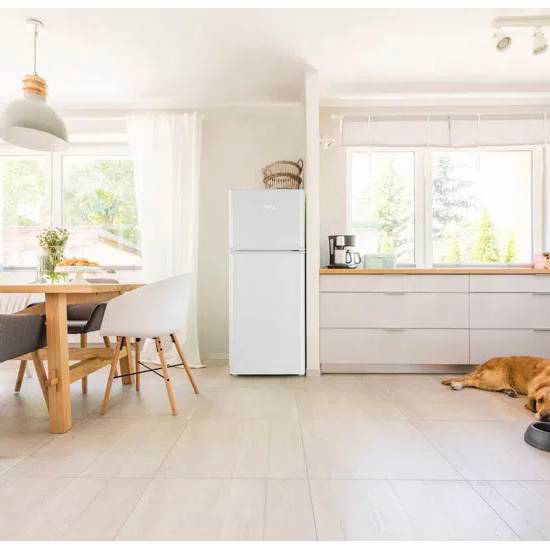 TCL RF207TWE1 je kompaktni kombinirani hladnjak sa zamrzivačem gore, ukupnog kapaciteta 207 litara i širine 55 cm. Ima LED osvjetljenje, podesive police, Fresh Zone, te funkcije Power Cool i Power Freeze za brzo hlađenje i zamrzavanje. Energetski je razred E, s dimenzijama 545 × 1440 × 550 mm i težinom 40 kg neto.