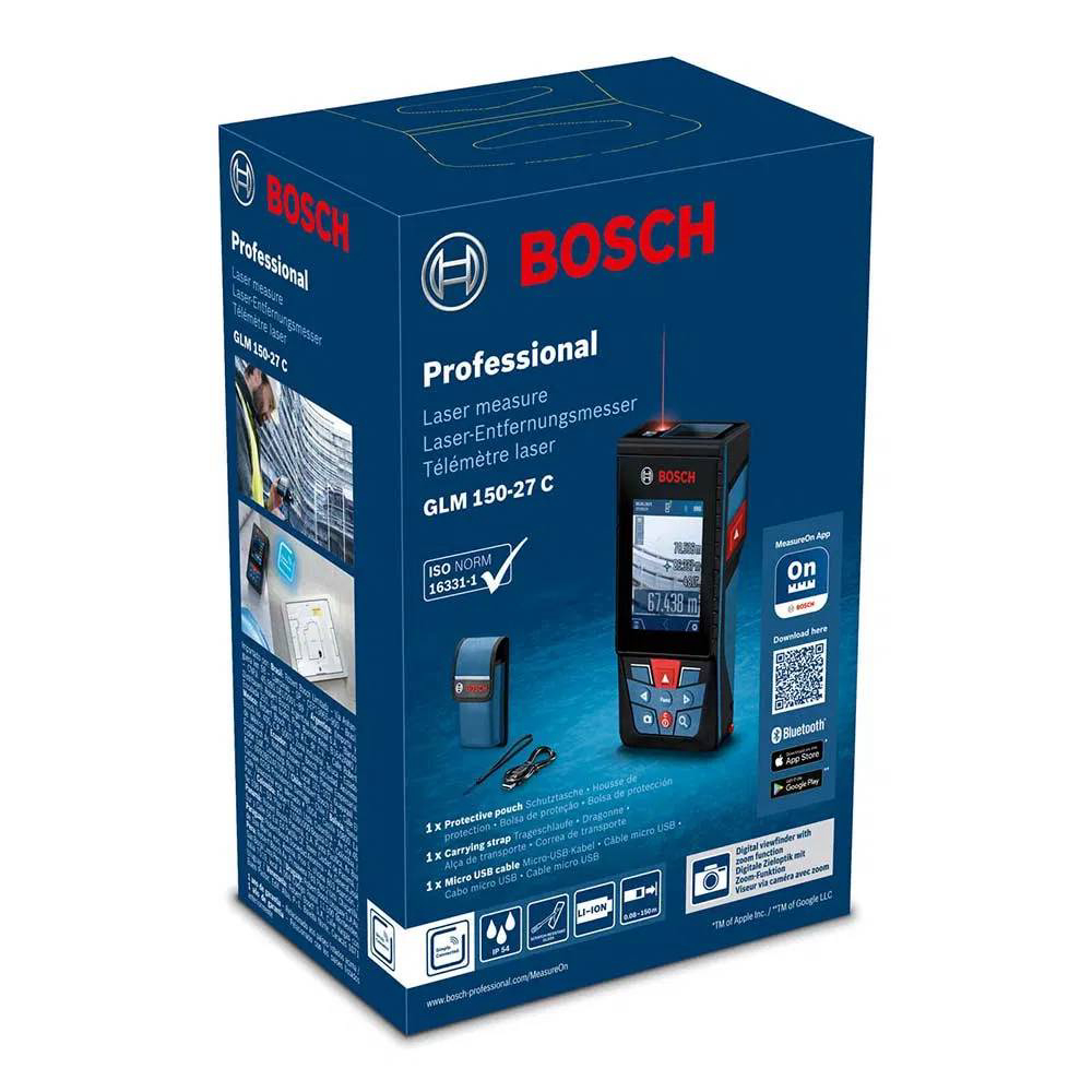 Laserski daljinomjer BOSCH GLM 150-27 sadrži tražilo digitalne kamere s funkcijom zumiranja za precizno mjerenje udaljenosti do 150 m. Mjerenja i slike automatski se spremaju i lako se čitaju zahvaljujući velikom, 2,8" IPS zaslonu u boji visokog kontrasta koji se okreće između portretnog i pejzažnog prikaza. Za prikladnu dokumentaciju, svi podaci mogu se prenijeti putem Bluetootha u aplikaciju Bosch MeasureOn ili putem USB-a povezivanje s računalom sa zaštitom IP54, staklom zaslona otpornim na ogrebotine i sučeljem jednostavnim za korištenje, ovaj laserski mjerač je praktičan svestrani uređaj za zahtjevna gradilišta. Arhitekti, građevinski menadžeri ili stručnjaci za HVAC instalaciju posegnut će za ovom pametnom laserskom mjerom zbog njene mogućnosti rada na velikim udaljenostima, jednostavne čitljivosti i prikladne dokumentacije. Sadrži integriranu litij-ionsku bateriju, što osigurava dugo vrijeme rada i veću fleksibilnost.