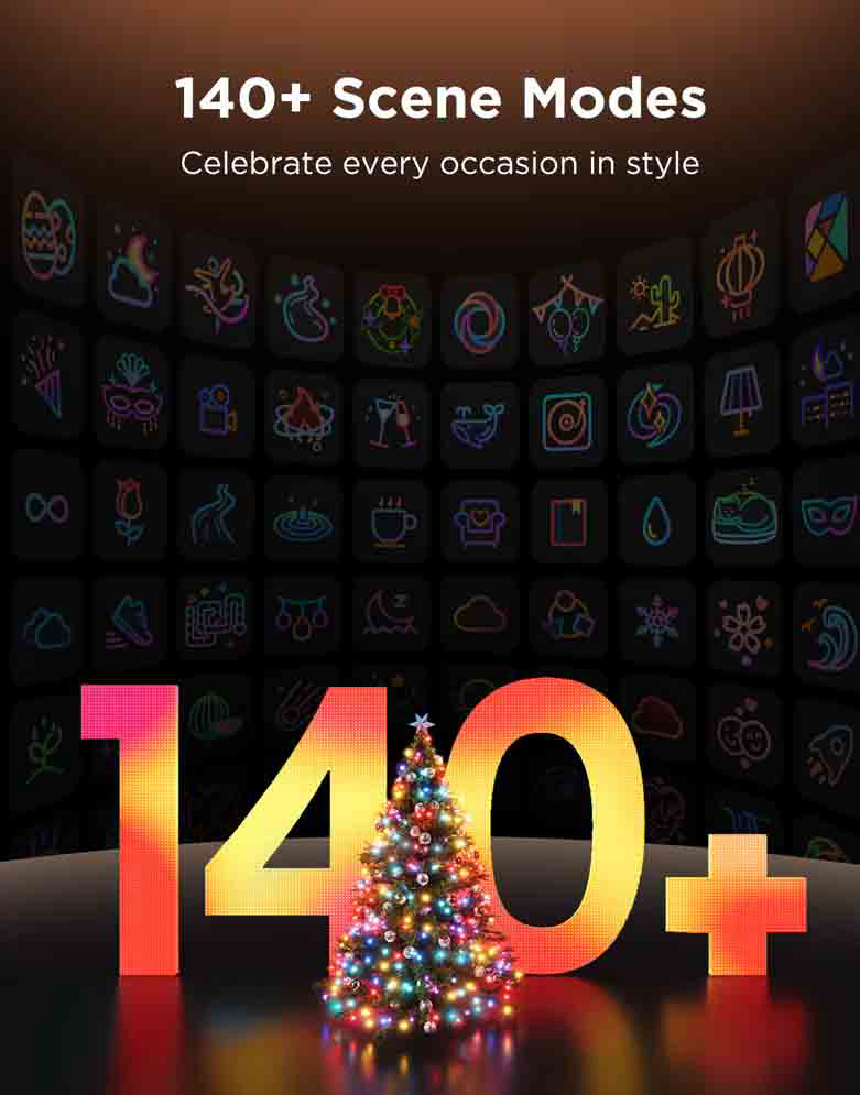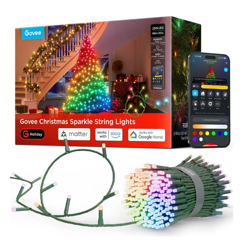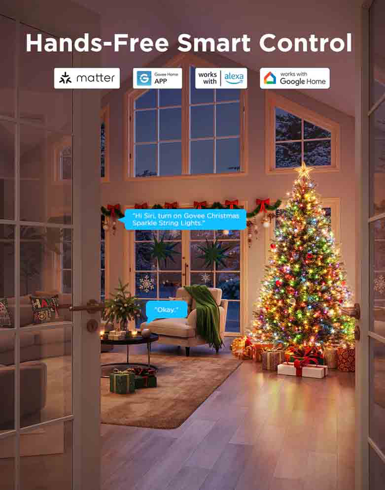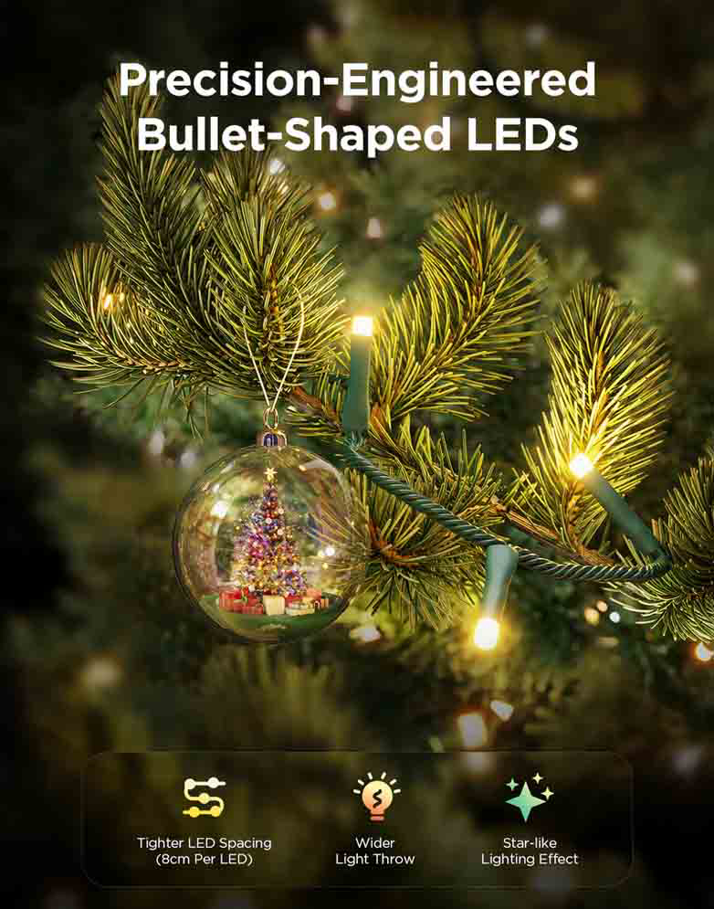 Govee Christmas Sparkle String Lights nisu samo obični svjetlosni niz – to je pametno rasvjetno rješenje koje pretvara vaš prostor u svjetleću instalaciju. Bilo da ukrašavate bor, prozor, terasu ili unutarnji zid, ovi nizovi pružaju nevjerojatnu fleksibilnost, visoku kvalitetu svjetla i mogućnost stvaranja vlastitih svjetlosnih scena za nezaboravan efekt. Sadrži 250 i 375 mliječno bijelih LED žaruljica u obliku metka koje pružaju efekt zvjezdanog svjetla. Koristi UNI-IC tehnologiju za pojedinačnu kontrolu LED žaruljica, omogućujući vam odabir između 16 milijuna boja i glatkih tekućih svjetlosnih efekata. Prilagodite temperaturu bijele boje prema svom blagdanskom raspoloženju. Koristite mapiranje oblika za precizno lociranje svake LED žaruljice, stvarajući prilagođene DIY svjetlosne efekte i otključavajući dinamičke unaprijed postavljene scene za atraktivnije blagdanske dekoracije.