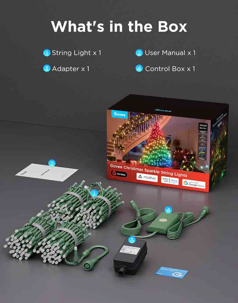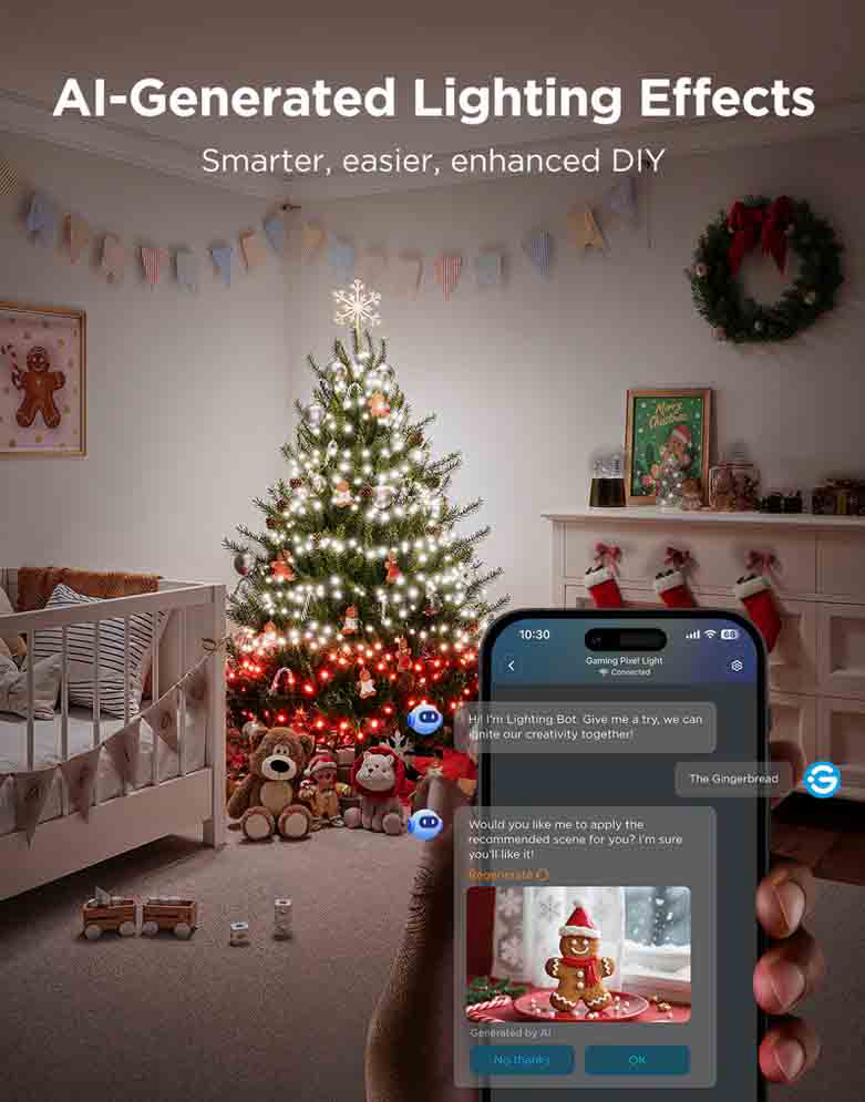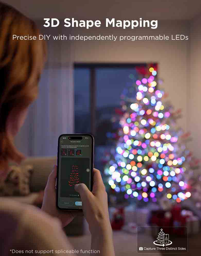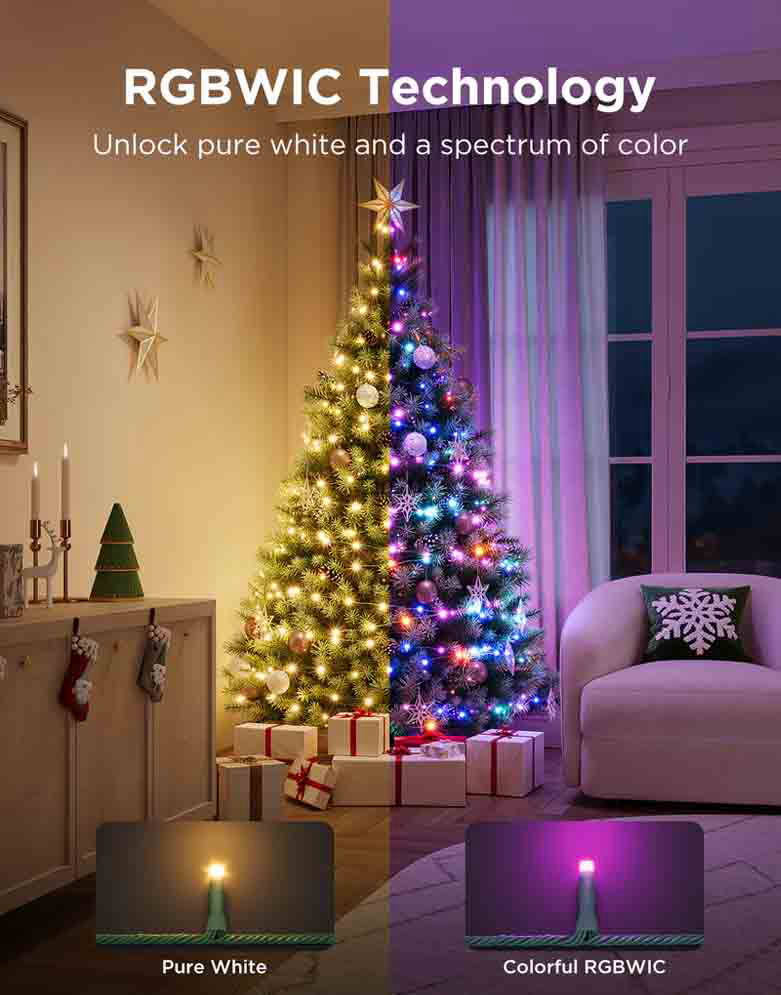 Govee Christmas Sparkle String Lights nisu samo obični svjetlosni niz – to je pametno rasvjetno rješenje koje pretvara vaš prostor u svjetleću instalaciju. Bilo da ukrašavate bor, prozor, terasu ili unutarnji zid, ovi nizovi pružaju nevjerojatnu fleksibilnost, visoku kvalitetu svjetla i mogućnost stvaranja vlastitih svjetlosnih scena za nezaboravan efekt. Sadrži 250 i 375 mliječno bijelih LED žaruljica u obliku metka koje pružaju efekt zvjezdanog svjetla. Koristi UNI-IC tehnologiju za pojedinačnu kontrolu LED žaruljica, omogućujući vam odabir između 16 milijuna boja i glatkih tekućih svjetlosnih efekata. Prilagodite temperaturu bijele boje prema svom blagdanskom raspoloženju. Koristite mapiranje oblika za precizno lociranje svake LED žaruljice, stvarajući prilagođene DIY svjetlosne efekte i otključavajući dinamičke unaprijed postavljene scene za atraktivnije blagdanske dekoracije.