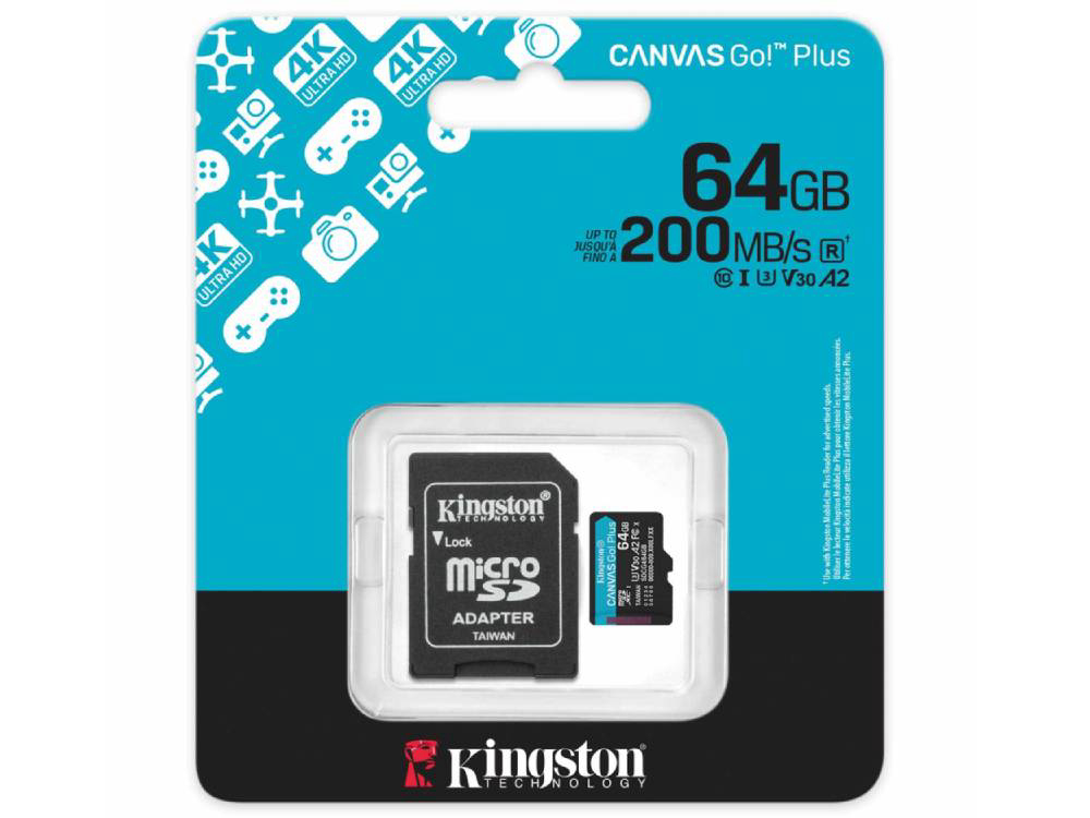 Kingston Canvas Go! Plus microSD kartica stvorena je za avanturiste i mobilne igrače, pružajući brzine čitanja do 200 MB/s1 za besprijekorno 4K UHD snimanje i brz rad aplikacija. S ocjenama U3 i V30, osigurava glatke snimke akcijske kamere i dronova, dok klasa A2 poboljšava mobilno igranje.