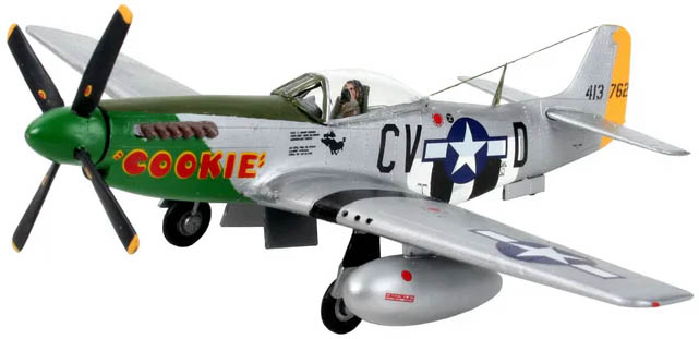 Modelarski set njemačkog proizvođača Revell koji prikazuje poznati američki borbeni avion P-51D Mustang iz Drugog svjetskog rata. Namijenjen je sastavljanju i bojanju, idealan za hobiste i početnike. Pravi P-51D Mustang bio je jedan od najuspješnijih lovačkih aviona Drugog svjetskog rata, s maksimalnom brzinom oko 721 km/h i velikim doletom, često korišten kao pratnja bombardera.