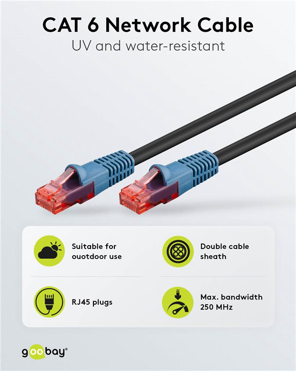 Dvoslojni polietilenski omotač štiti mrežni kabel na otvorenom i čini ga izuzetno otpornim na vremenske uvjete. Vanjski Ethernet kabel idealan je za vrt, balkon, kampiranje, pročelja zgrada i nadzorne kamere. Visokokvalitetna aluminijska žica obložena bakrom (CCA) i pozlaćeni kontakti jamče izvrsnu i snažnu mrežnu vezu. Zaštita zasuna na RJ45 konektoru sprječava zapinjanje ili lomljenje zasuna, pomažući u osiguravanju pouzdane internetske veze. Vanjski kabel CAT 6 prikladan je za Gigabit Ethernet s brzinama do 10/100/1000 Mbit/s Mrežni konektor: redoslijed parova prema EIA/TIA 568B