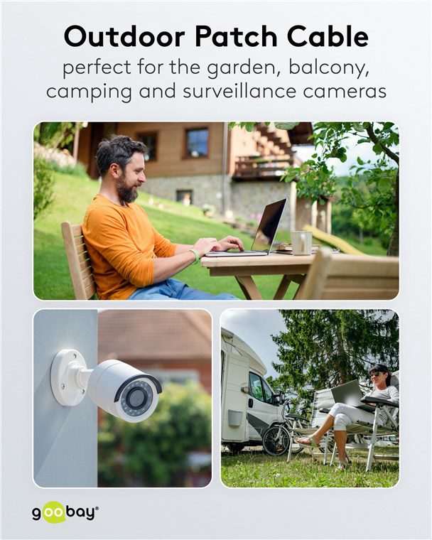 Goobay mrežni kabel idealan je za vanjsku upotrebu, npr. u vrtu, za kampiranje, na pročeljima zgrada i za spajanje nadzornih kamera. Dvoslojni omotač kabela od polietilena izuzetno je otporan na vremenske uvjete i UV zračenje.