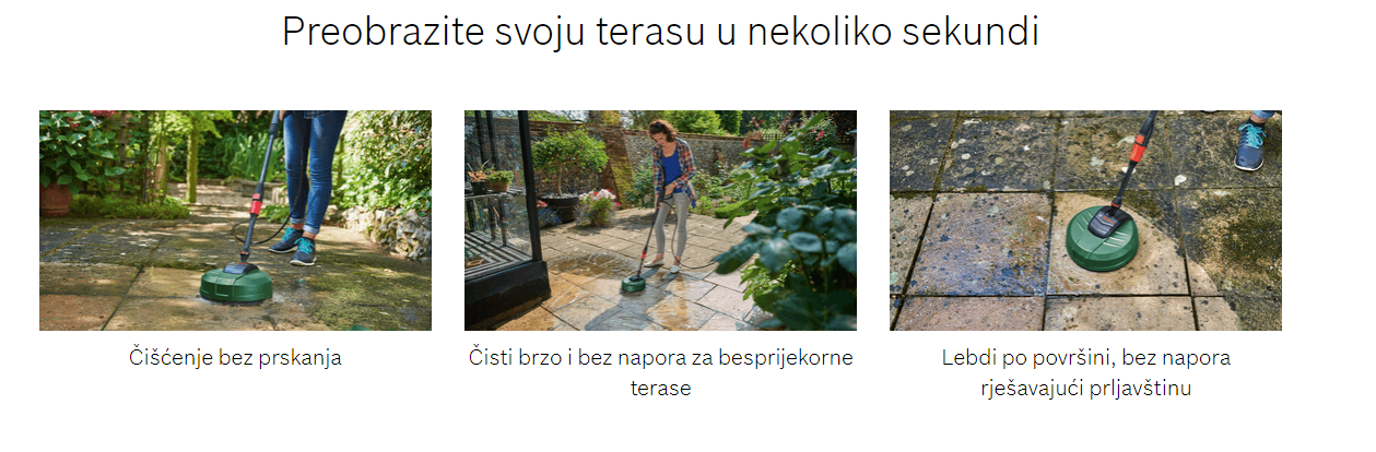 Bosch AquaSurf 250 čistač dvorišta za čišćenje manjih dvorišta i prilaznih putova. Nagnuti zglob za bržu i udobniju uporabu. Nazivni tlak do 135 bara. Promjer glave čistača 250 mm. Idealan uređaj za čišćenje betona, pločnika i terasa. Savršen uređaj za uklanjanje mahovine. Letvica četke omogućuje čistaču dvorišta da lebdi iznad površine.