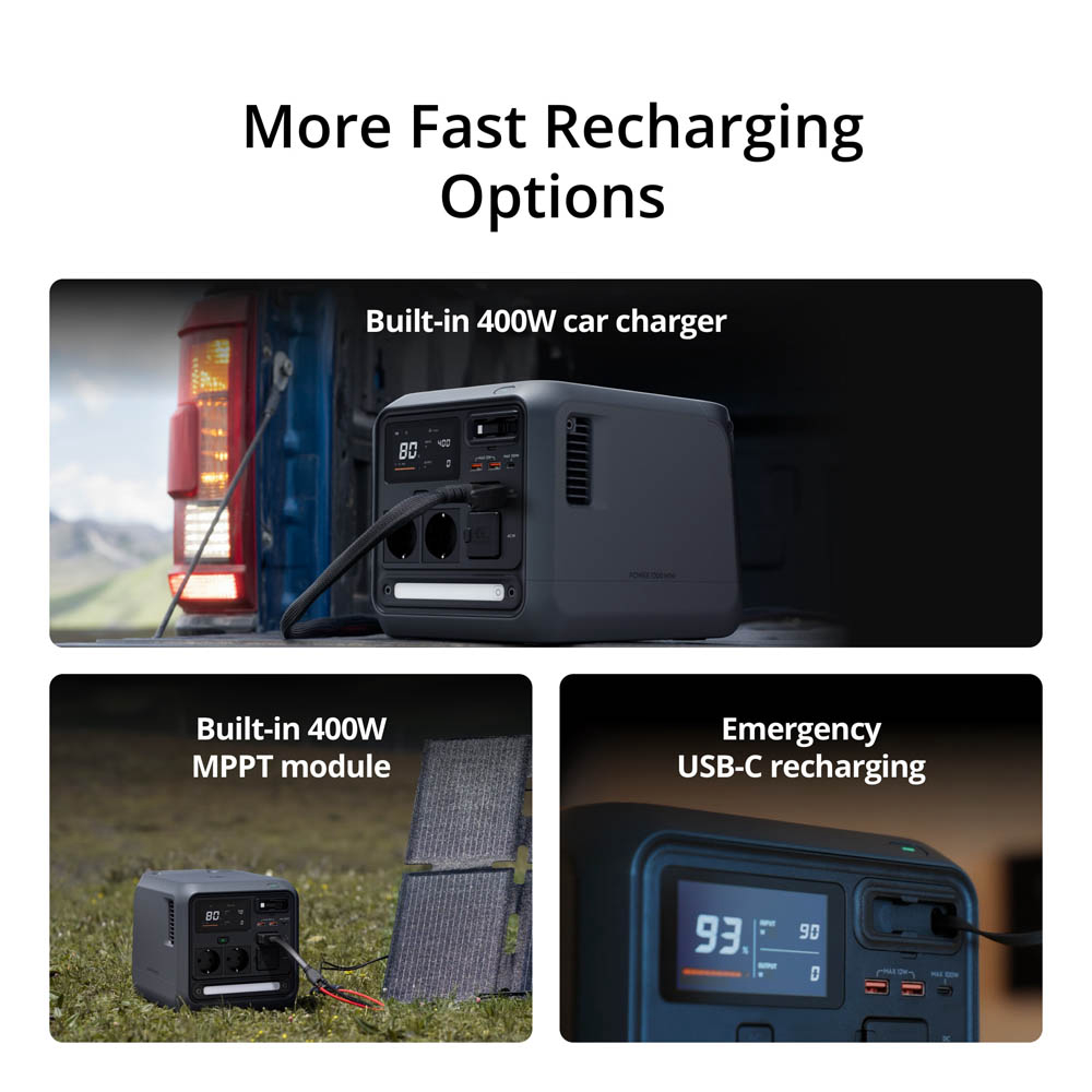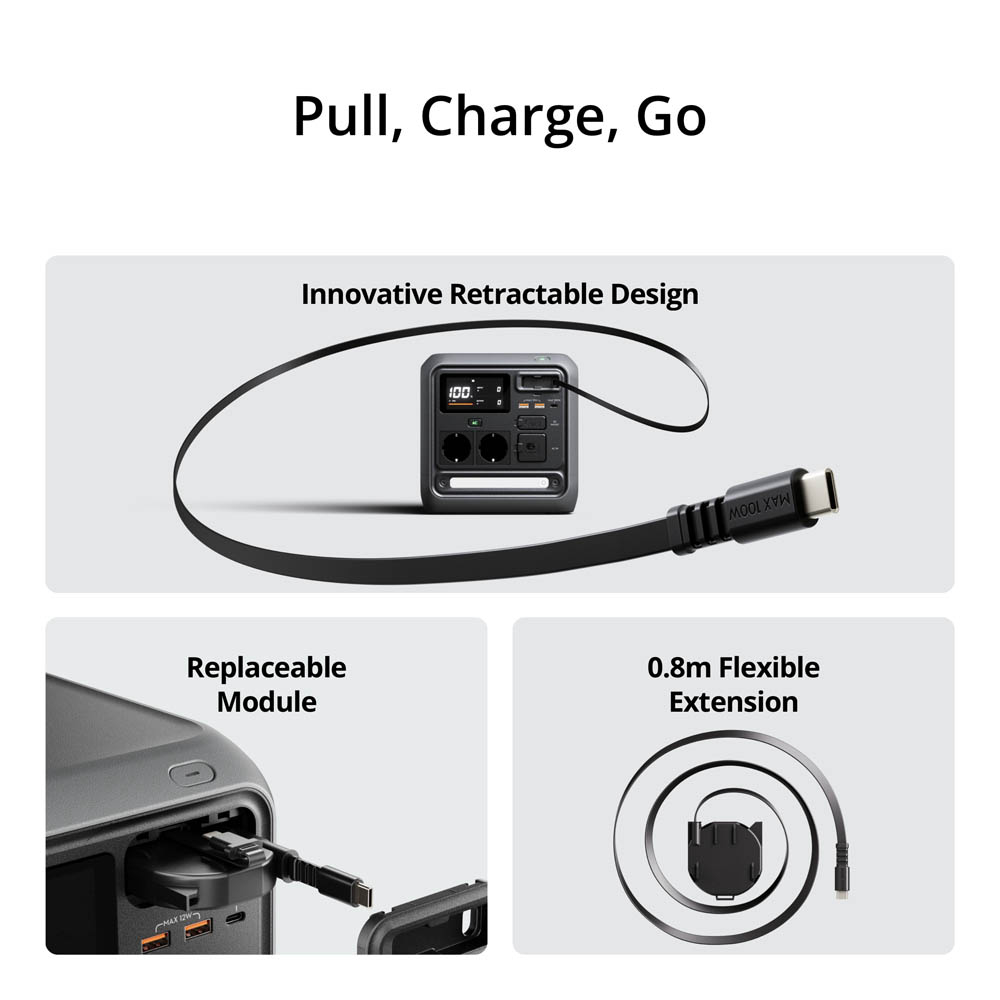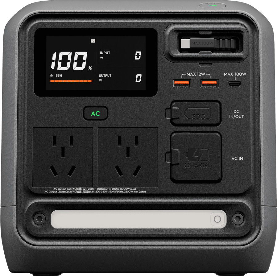 DJI Power 1000 Mini opremljen je praktičnim ugrađenim USB-C kabelom snage 100 W, dodatnim priključcima (USB-C, USB-A i AC utičnice) te podrškom za solarno punjenje, što ga čini fleksibilnim rješenjem za rad, putovanja i outdoor aktivnosti.