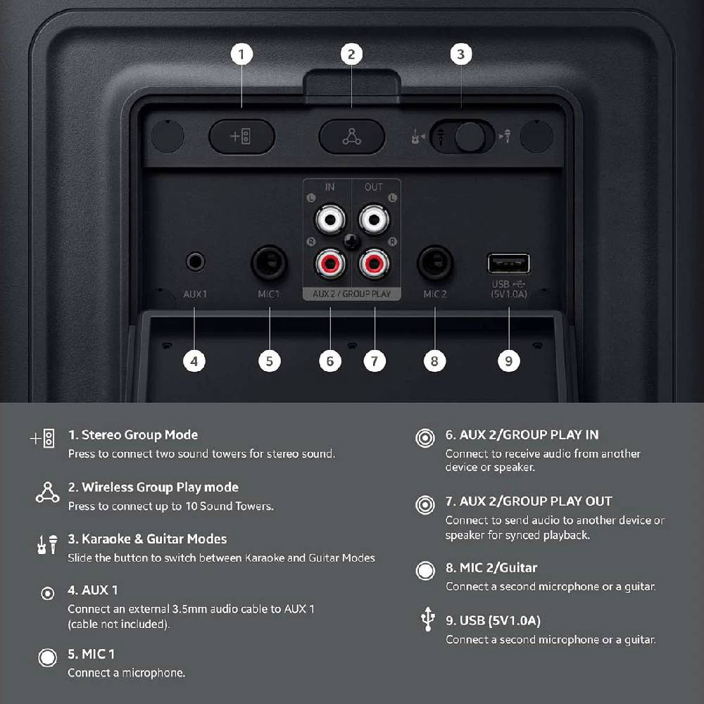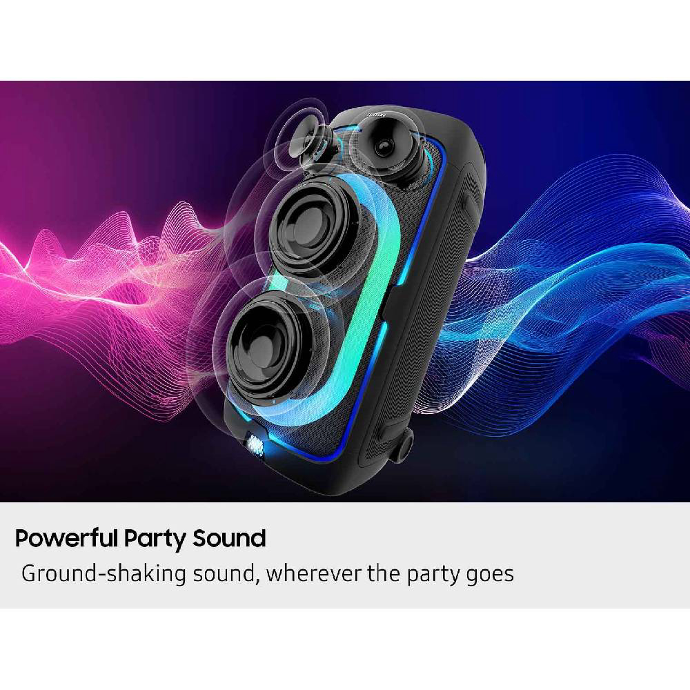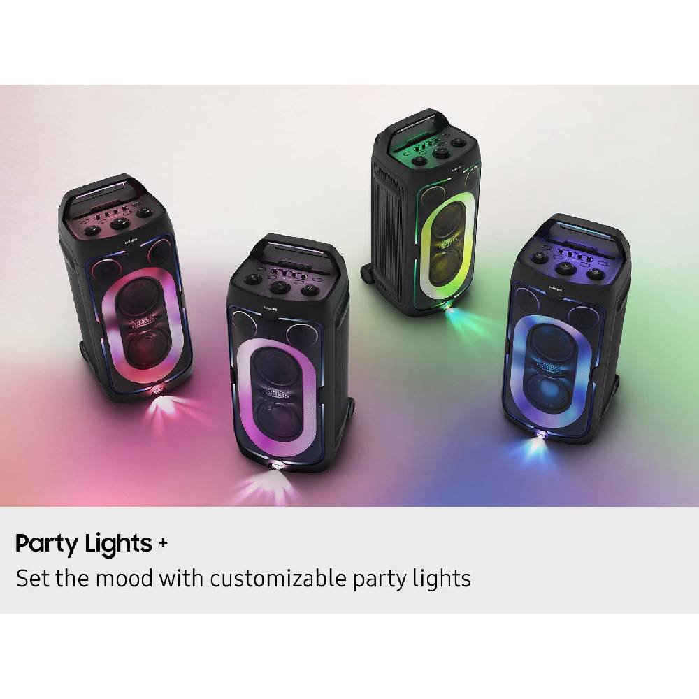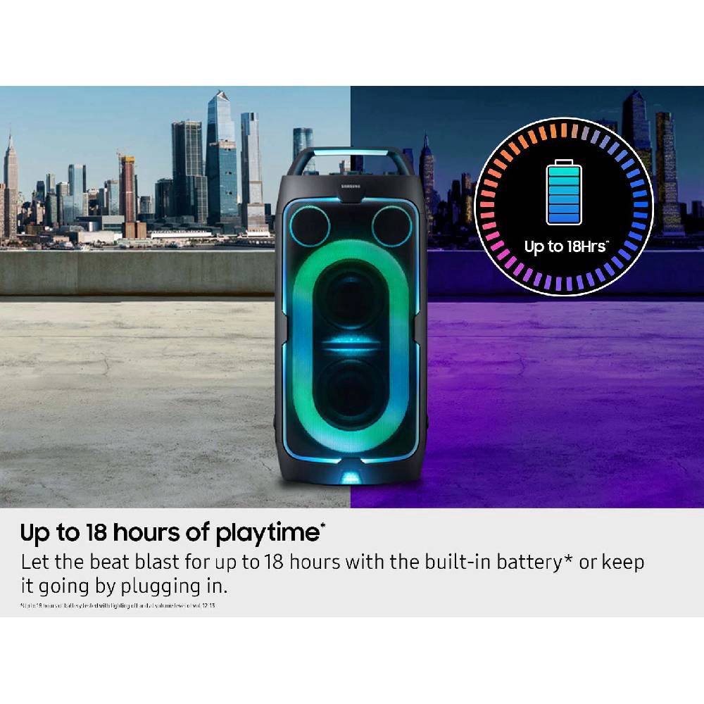 Osvježite atmosferu uz pet prilagodljivih načina rada i šest uzoraka osvjetljenja koji će vašem zvučniku omogućiti da zablista. Prilagodite postavke raspoloženja i osvjetljenje ritmu ili atmosferi putem aplikacije Samsung Sound Tower. Neka ritam trešti do 18 sati s ugrađenom baterijom - savršeno za kasnonoćna druženja ili avanture u pokretu. Kada se baterija isprazni, samo priključite svoj Sound Tower kako bi glazba nastavila svirati bez propuštanja ritma. Ponesite zabavu gdje god idete s ugrađenim kotačima i podesivom teleskopskom ručkom koja se proteže do pet različitih razina. Bilo da ste na parkiralištu ili u ugodnoj filmskoj večeri, bez napora ponesite zabavu sa sobom. Pretvorite svoju zabavu u jam session. Uključite dva mikrofona - ili mikrofon i gitaru - i pripremite se za pjevanje, sviranje i nastup s prijateljima. Uz Sound Tower aplikaciju otključajte posebne DJ efekte kako bi vaša playlista bila jača nego ikad prije. Odaberite svoj omiljeni način rada za bas. Način rada Punch pruža oštar, snažan bas; način rada Deep donosi bogat, tutnjajući bas; a način rada Gentle za gladak i ugodan bas. Svaki način rada dodaje vlastitu dubinu i punoću, čineći vaš zvuk snažnijim tako da možete postaviti vibraciju baš kako želite.