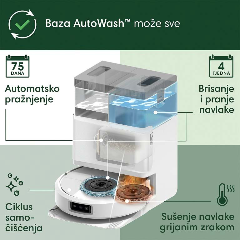| 1x robotski usisavač, 1x AutoWash stanica za punjenje, 1x kabel za napajanje, 1x dodatni set dvostrukih navlaka, 1x dodatna vrećica za smeće | |