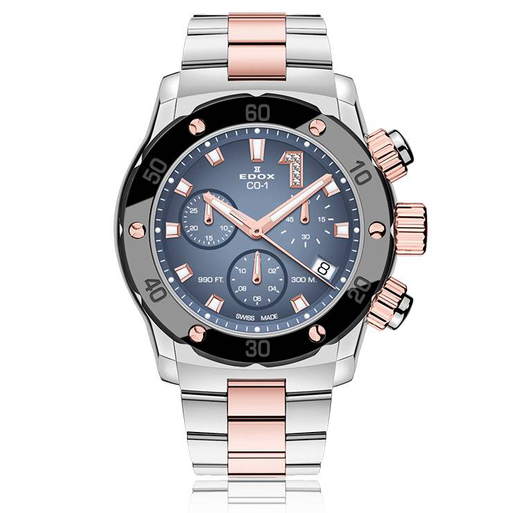Ženski sat Edox CO-1 Chronolady 10255 357RM BUIDR spaja sportsku funkcionalnost s elegantnim detaljima i vrhunskom švicarskom preciznošću. Odlikuje ga kućište promjera 38 mm od nehrđajućeg čelika s bicolor površinskom obradom, safirno staklo otporno na ogrebotine te luminiscentne kazaljke i indeksi. Sat pokreće švicarski kvarcni mehanizam Ronda 5030 D, uz funkcije kronografa i prikaza datuma, dok vodootpornost do 300 m / 30 bara i zavrtna krunica jamče pouzdanost pri kontaktu s vodom. Model je dodatno ukrašen pravim diamantima na brojčaniku i dolazi s čeličnom narukvicom s leptir-kopčom.