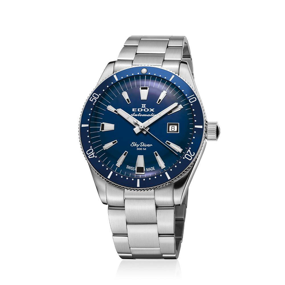 Ručni sat Edox SkyDiver Neptunian 80126 3BUM BUIN je robustan švicarski automatski sat namijenjen je ljubiteljima sportskih i ronilačkih satova. Pokreće ga automatski mehanizam Edox Caliber 80 (baziran na Sellita SW200) s rezervom snage oko 38 sati i funkcijom prikaza datuma na poziciji 3 sata. Kućište od nehrđajućeg čelika promjera 42 mm zaštićeno je kupolastim safirnim staklom, dok jednosmjerno rotirajuća keramička ronilačka luneta i vodootpornost do 300 m / 30 ATM osiguravaju pouzdanost u zahtjevnim uvjetima. Plavi brojčanik s Super-LumiNova luminiscencijom pruža izvrsnu čitljivost.