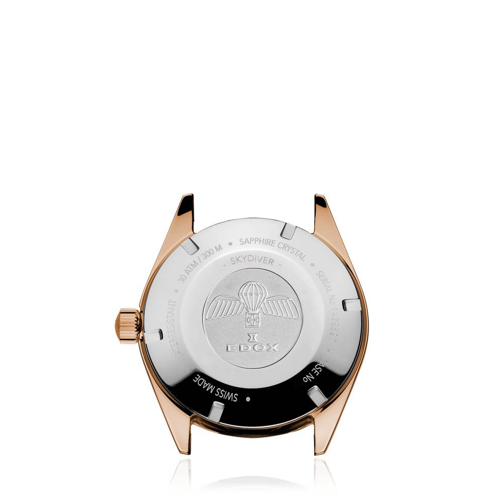 Ručni sat Edox SkyDiver Neptunian 80131 37RNC NI je švicarski automatski ronilački sat koji spaja vintage inspirirani dizajn s modernim performansama. Pokreće ga automatski mehanizam Edox Caliber 80 (baziran na Sellita SW200) s rezervom snage oko 38 sati i funkcijom prikaza datuma. Kućište promjera 38 mm izrađeno je od nehrđajućeg čelika s PVD premazom u boji ružičastog zlata, a štiti ga kupolasto safirno staklo otporno na ogrebotine. Sat ima jednosmjerno rotirajuću lunetu i vodootpornost do 300 m / 30 ATM, što ga čini pogodnim i za ronjenje. Crni brojčanik s luminiscencijom Super-LumiNova osigurava odličnu čitljivost, dok kožni remen s klasičnom kopčom daje elegantan završni izgled.