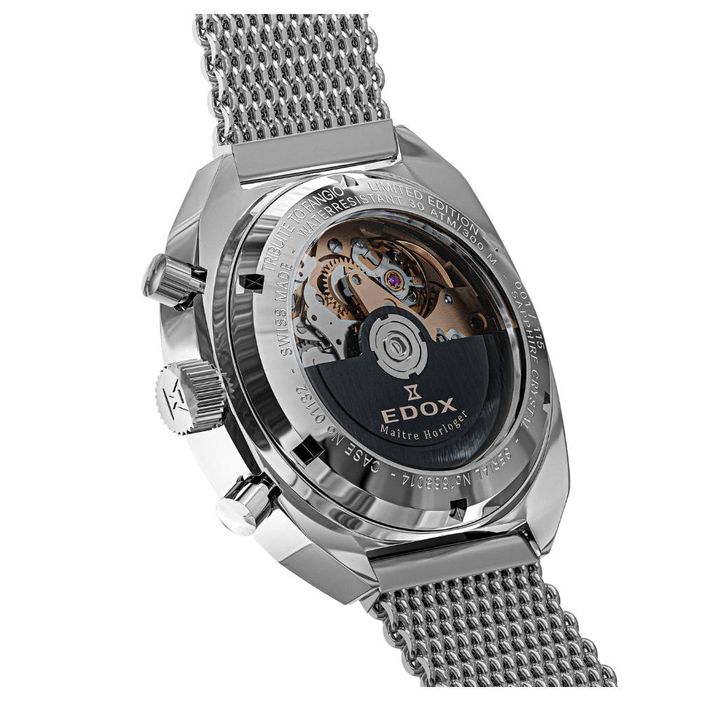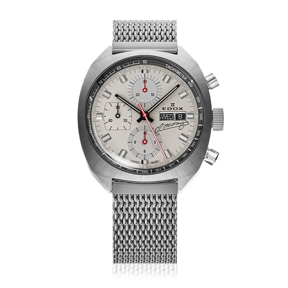 Ručni sat Edox Sportsman 01132 3G BEAN je sportski švicarski kronograf koji spaja klasični motorsport dizajn s vrhunskom mehaničkom izradom. Pokreće ga automatski mehanizam Edox Caliber 011 (baziran na Sellita SW500) s rezervom snage oko 48 sati, a nudi funkcije kronografa (štoperice), datuma i prikaza dana u tjednu. Kućište promjera 41 mm izrađeno je od nehrđajućeg čelika te je zaštićeno safirnim staklom, dok čelična narukvica s preklopnom kopčom osigurava udobnost i stabilnost na ruci. Sat je vodootporan do 300 m / 30 ATM, ima luminiscenciju na kazaljkama i indeksima te fiksnu lunetu, a dolazi i kao limitirano izdanje posvećeno legendarnom vozaču Juanu Manuelu Fangiou.
