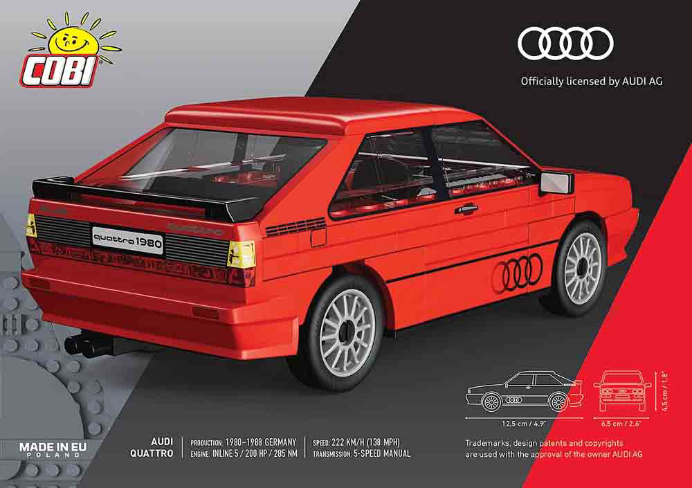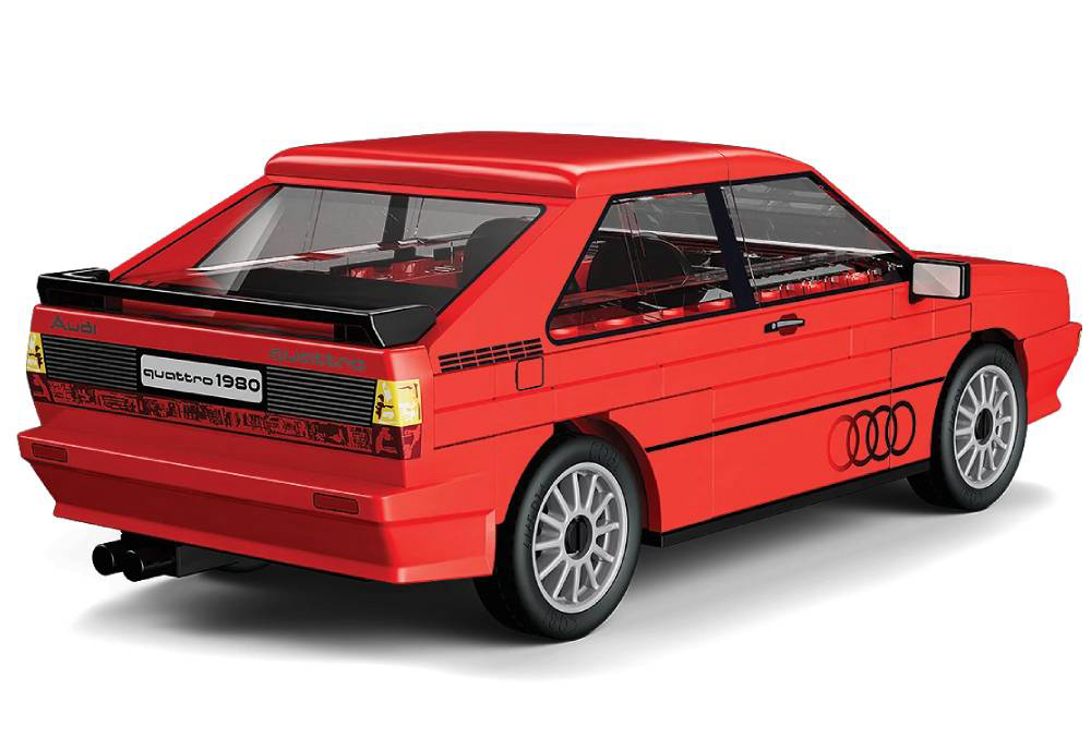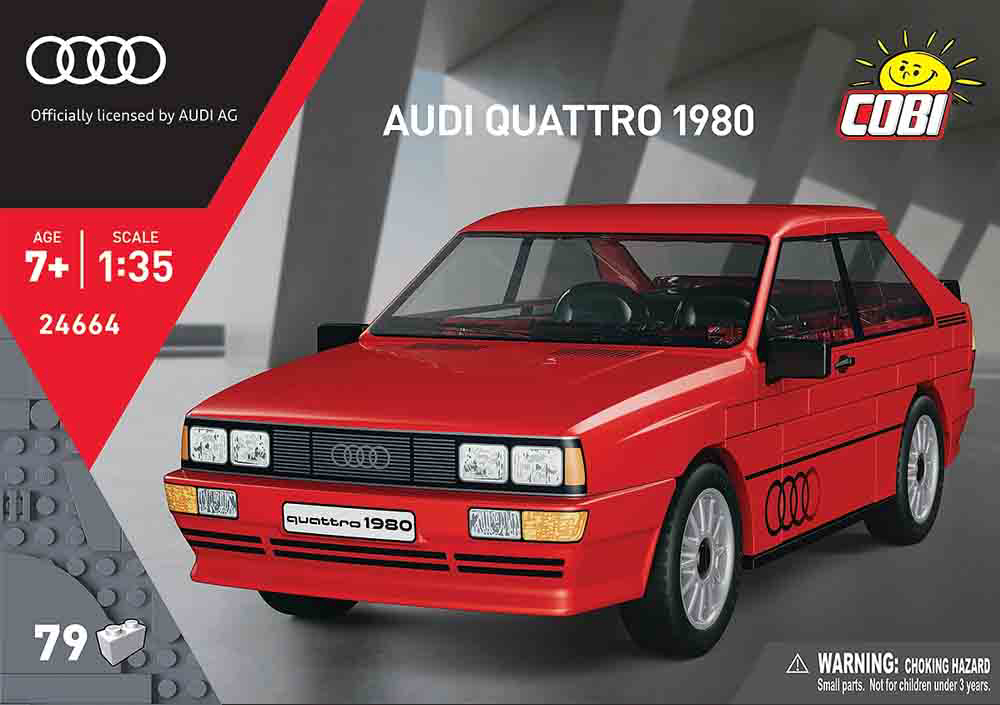 Audi quattro je debitirao 3. ožujka 1980. na Genova Motor Show-u. Već 1981. godine pobijedio je u svojoj debitantskoj utrci - Jänner Rally-u. Tako je uveo eru dominacije 4x4 pogona i zauvijek učvrstio svoje mjesto u povijesti motosporta. Sada možete sastaviti jednu od najvećih automobilskih ikona 1980-ih! Sastoji se od 79 dijelova. Ovaj set namijenjen je osobama starijim od 7 godina. Dimenzije: 12.5 cm x 6.2 cm x 4.5 cm. COBI kocke kompatibilne s LEGO kockama.