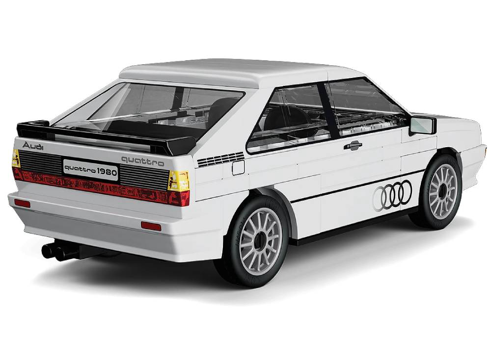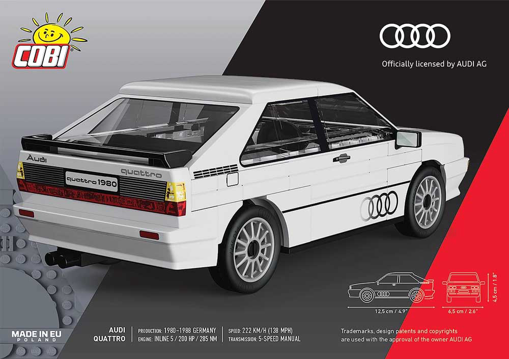Audi quattro je debitirao 3. ožujka 1980. na Genova Motor Show-u. Već 1981. godine pobijedio je u svojoj debitantskoj utrci - Jänner Rally-u. Tako je uveo eru dominacije 4x4 pogona i zauvijek učvrstio svoje mjesto u povijesti motosporta. Sada možete sastaviti jednu od najvećih automobilskih ikona 1980-ih! Sastoji se od 79 dijelova. Ovaj set namijenjen je osobama starijim od 7 godina. Dimenzije: 12.5 cm x 6.2 cm x 4.5 cm. COBI kocke kompatibilne s LEGO kockama.