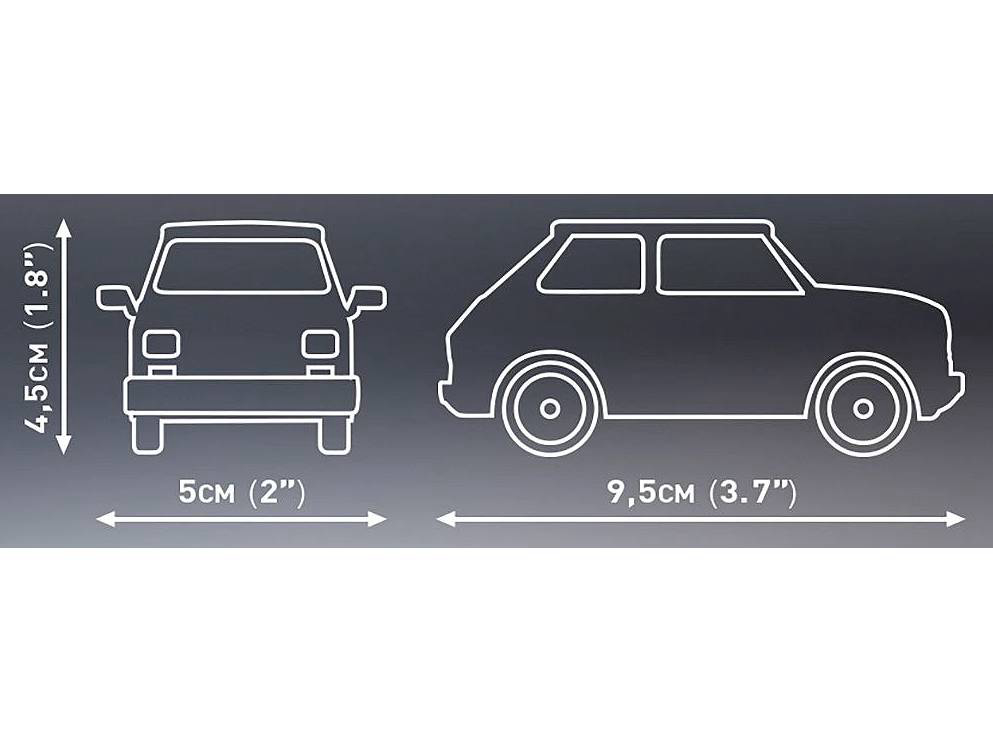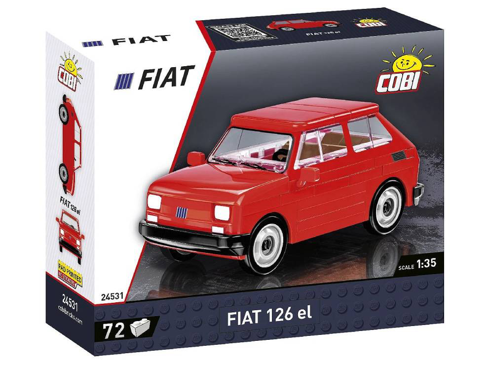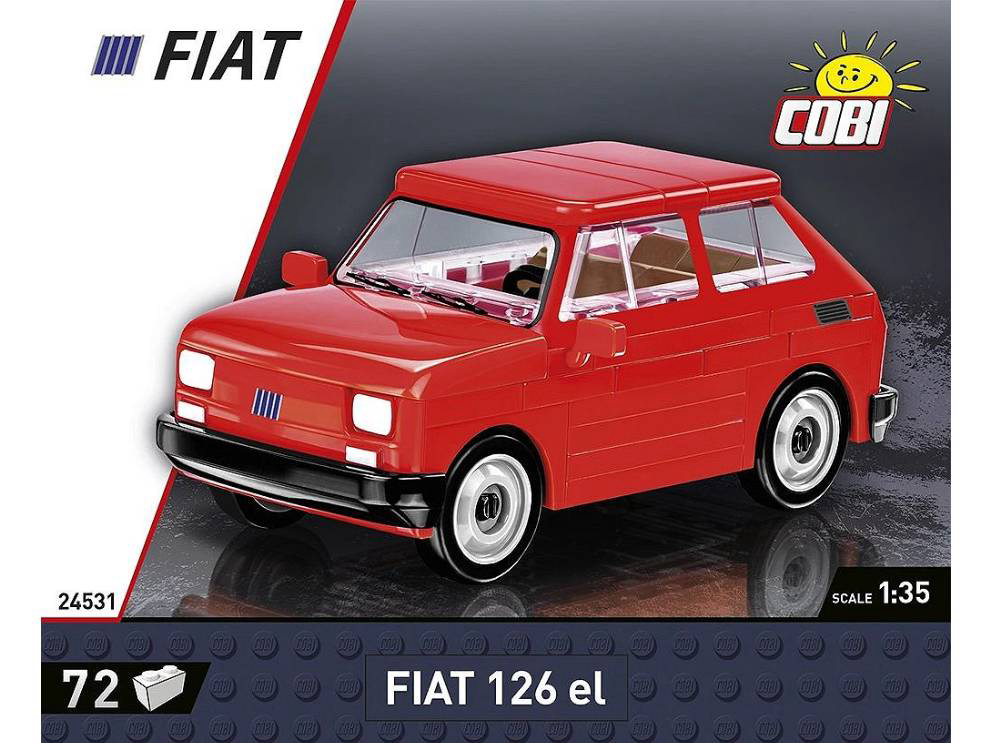 Fiat 126p el kultno je talijansko vozilo. Licencirani model u mjerilu 1:35 sastoji se od 72 elemenata. Ima pomične kotače s gumenim gumama. Odličan je za kolekcionarsku policu, kao i za zabavu najmlađih ljubitelja automobilizma. Set se preporučuje osobama starijim od 5 godina. Dimenzije: 9.5 cm x 5.5 cm x 4.5 cm. COBI kocke kompatibilne s LEGO kockama.
