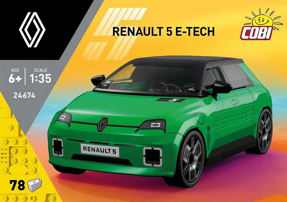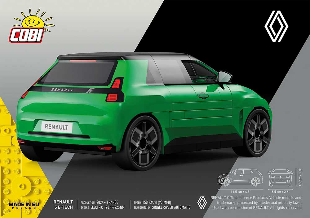 Legenda se vraća u novom obliku! Izgradite model Renaulta 5 E-Tech Electric u mjerilu 1:35! Renault 5 jedna je od najvećih ikona europskog automobilizma druge polovice 20. stoljeća, model koji kombinira kultni dizajn s modernom tehnologijom nulte emisije. Sastoji se od 78 dijelova. Set se preporučuje osobama starijim od 6 godina. Dimenzije: 11.5 cm x 6.5 cm x 4.5 cm. COBI kocke kompatibilne s LEGO kockama.