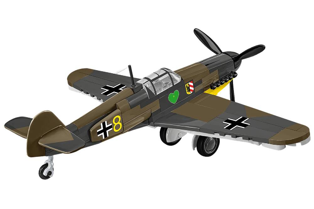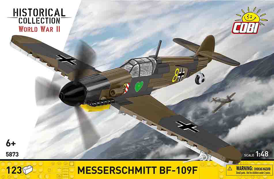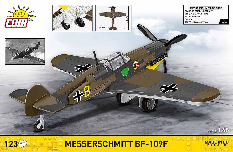 Messerschmitt Bf 109 bio je glavni lovac njemačkog Luftwaffea tijekom Drugog svjetskog rata i jedan od najprepoznatljivijih dizajna zrakoplova u povijesti! Verzija Bf 109F "Friedrich", uvedena u proizvodnju na prijelazu 1940./1941., predstavljala je pravi prekretnicu u razvoju ovog zrakoplova. Iako je koristio isti motor DB 601E kao i ranija E verzija, trup je temeljito redizajniran. Zaobljeni vrhovi krila značajno su poboljšali aerodinamiku što je rezultiralo max brzinom do 635 km/h na nadmorskoj visini od 6000 m. Naoružanje, koje se sastojalo od dva mitraljeza MG 17 i topa MG 151 kalibra 20 mm, učinilo je "Friedricha" zastrašujućim protivnikom u zračnim borbama. Sastoji se od 123 dijelova. Ovaj set namijenjen je osobama starijim od 6 godina. Dimenzije: 19 cm x 21 cm x 9 cm. COBI kocke kompatibilne s LEGO kockama.