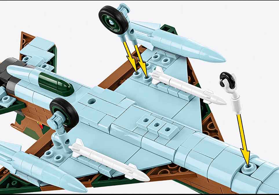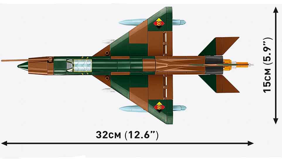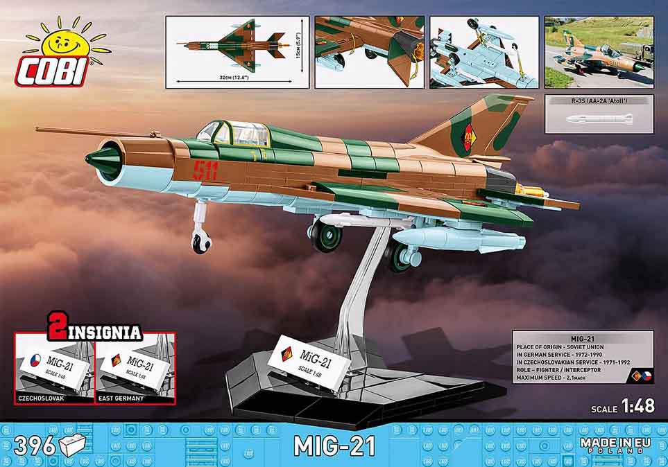 Model MiG-21, legenda vojnog zrakoplovstva Varšavskog pakta s čehoslovačkim i istočnonjemačkim oznakama. MiG-21 jedan je od najprepoznatljivijih borbenih zrakoplova u povijesti vojnog zrakoplovstva. Simbol je zračne moći Varšavskog pakta i neodvojivi element neba nad Istočnom Europom tijekom Hladnog rata. Set se sastoji od 396 precizno dizajniranih dijelova koji vjerno reproduciraju karakterističnu siluetu zrakoplova MiG-21 u mjerilu 1:48. Set se preporučuje osobama starijim od 8 godina. Dimenzije: 32 cm x 15 cm x 9.5 cm. COBI kocke kompatibilne s LEGO kockama.